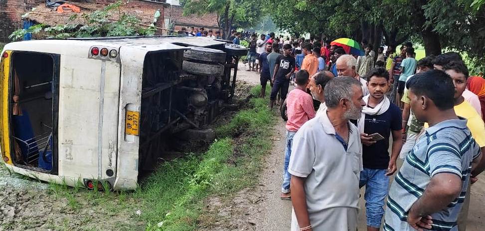 जौनपुर धारा, गौराबादशाहपुर। थाना क्षेत्र के चौकी पिलखुआ गांव में सोमवार को सुबह सात बजे बारिश के दौरान बच्चों को लेकर विद्यालय जा रही जगमोहन पब्लिक स्कूल महरूपुर की बस अनियंत्रित होकर सड़क किनारे खेत में पलट गयी। बस पलटते ही बच्चे चीख पुकार करने लगे। आसपास रहे ग्रामीण दौड़ पड़े। ग्रामीणों ने बस के पीछे का शीशा तोड़कर सभी बच्चों को सुरक्षित बाहर निकाला। बस का चालक बाल बाल बच गया। उसको चोट नहीं आयी। बस में करीब 42 बच्चे सवार थे जिसमें 12 बच्चे घायल हुए। अन्य सभी बच्चे भी मामूली रूप से चुटहिल हुए हैं। सूचना मिलते ही अभिभावक और स्कूल स्टाफ मौके पर पहुंच गया। अभिभावक अपने-अपने बच्चों को स्थानीय चिकित्सक से इलाज कराकर घर ले गये। घायलों में अनिष्का, आर्यन, अनन्या, इशिका, अंशिका, संजीत, मोहम्मद, प्रगति, साक्षी, अमन, कशिश, गुंजन अन्य बच्चे शामिल हैं। स्कूल की बस सुबह कुकुहां गांव से बच्चों को लेकर चौकी पिलखुआ गांव पहुंची थी। चौकी पिलखुआ गांव से भी बच्चों को लेकर स्कूल के लिए चली। प्रत्यक्षदर्शियों के अनुसार बस गांव के मंदिर से जैसे ही आगे बढ़ी अनियंत्रित होकर पलट गयी। इस प्रकरण में पूछे जाने पर थाना प्रभारी रमेश कुमार ने बताया कि उक्त मामले में यदि किसी भी बच्चों के परिजन लिखित तहरीर देते हैं तो जांच कर उचित कार्रवाई की जाएगी।