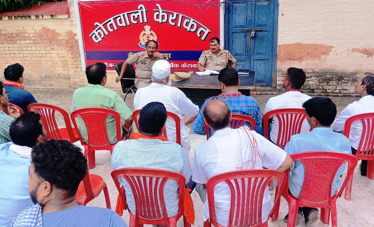 जौनपुर धारा, जौनपुर। केराकत कोतवाली थाना परिसर में प्रभारी निरीक्षक जय प्रकाश यादव की अध्यक्षता में अभियान दृष्टि के अंतर्गत केराकत बाजार में सभी बड़े व्यापारियों के बीच बैठक की गयी। जिसमें प्रभारी निरीक्षक ने सभी कस्बा व गली बाजार के व्यापारियों को अपनी-अपनी दुकान में अच्छे से अच्छा कैमरा लगाने की अपील किया और साथ ही सुरक्षा व्यवस्था को लेकर लोगों को जागरूक किया। उन्होंने कहा कि बाजार व क्षेत्र में लूट जैसे अपराध की रोकथाम के लिए आप लोग अपनी-अपनी दुकानों में कैमरा लगवाकर सुरक्षा के दृष्टिगत यह अभियान दृष्टि चलाया जा रहा है। इस अवसर पर क्राइम इंस्पेक्टर देवेंद्र सिंह, हेड कांस्टेबल बाबूलाल राय, हेड कांस्टेबल सुहेल अहमद, गोगा, मो. आजाद, चंद्रशेखर गुप्ता, विष्णु गुप्ता, नसीम के साथ अन्य लोग मौजूद रहे।