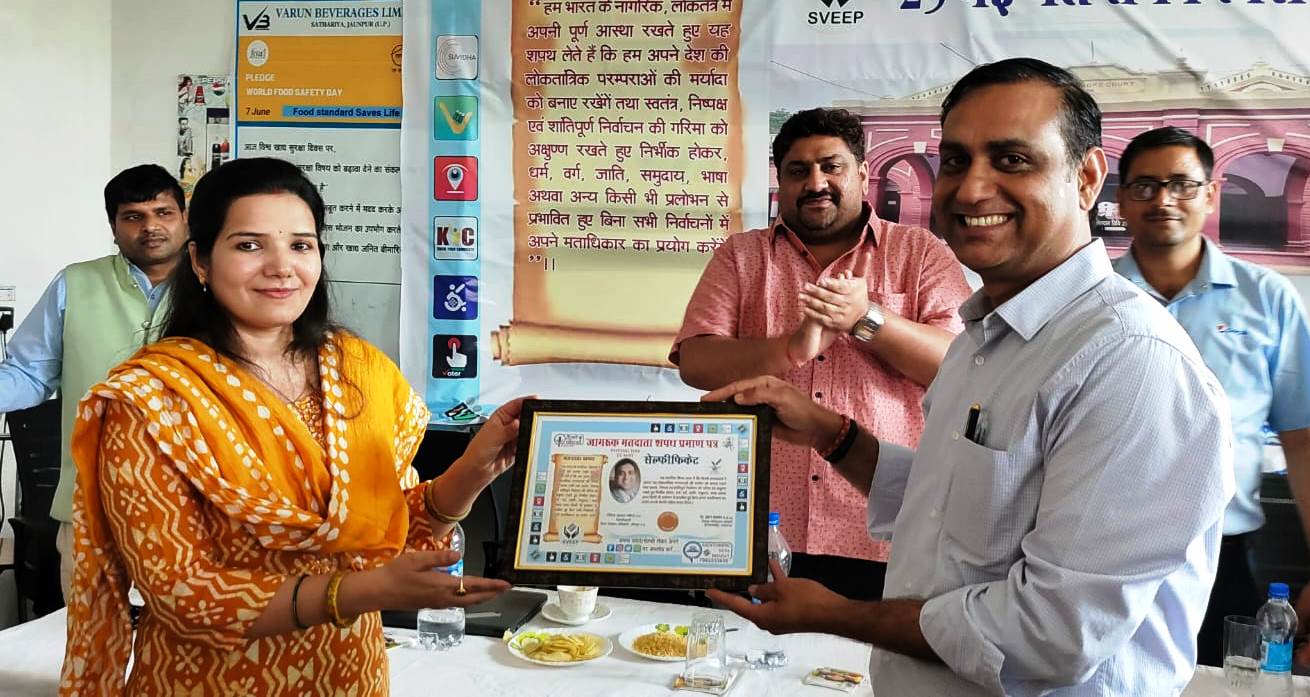 जौनपुर धारा,जौनपुर। सतहरिया-औद्योगिक क्षेत्र सतहरिया में स्थित वरूण बेवरेजेज लिमिटेड में सोमवार को निर्वाचक रजिस्ट्रीकरण अधिकारी डॉ.ज्ञान प्रकाश ने उद्यमियों के साथ बैठक कर मतदान के लिए जागरुक किया। ईआरओ डॉ.ज्ञान प्रकाश ने आगमी 25 मई को होने वाले लोकसभा चुनाव में शत् प्रतिशत मतदान करने के लिए उद्यमियों को जागरूक किया और कहा कि यह देश का सब से बड़ा महापर्व है। उद्यमीगण अपने उत्तरदायित्व का निर्वहन करते हुए इस महापर्व में अधिक से अधिक लोगों को इसमें भाग लेने के लिए प्रेरित करें जिससे देश का लोकतंत्र मजबूत हो सके और कहा कि एक एक वोट बहुत ही कीमती है। इस लिए कोई भी मतदान से वंचित न होने पाए। उन्होंने उपस्थित राजस्व विभाग के सभी अधिकारियों व कर्मचारियों को निर्देशित किया कि मतदाताओं से मिलकर उन्हें मतदान का महत्व समझाए। निर्भीक व निडर होकर मतदान करने के लिए मतदान केन्द्रों पर जाए। इसमें किसी भी प्रकार के प्रलोभन से बच कर मतदान करना चाहिए। किसी भी प्रकार का चुनाव से संबंधित कोई दिक्कत आए तो इसकी सूचना हमे दिया जाए। मतदान के लिए लोगों को शपथ दिलाई गई। फैक्ट्री के जीएम प्रेरणा व एचआर शिव कुमार ने आगुंतकों के प्रति आभार ज्ञापित किया। इस दौरान अतिरिक्त उपजिलाधिकारी प्रजाक्ता त्रिपाठी, जिला उपायुक्त हर्ष प्रताप सिंह, तहसीलदार अजीत कुमार, नायब तहसीलदार सूरज कुमार पटेल, आई.आई.ए अध्यक्ष बृजेश कुमार यादव, सीडा विकास समिति अध्यक्ष शिवा सिंह, उद्यमी नेता राहुल दूबे, महेन्द्र श्रीवास्तव, गुलाब चन्द्र पाण्डेय, अरविंद मौर्य सहित राजस्व विभाग के अधिकारी व कर्मचारी मौजूद रहे।