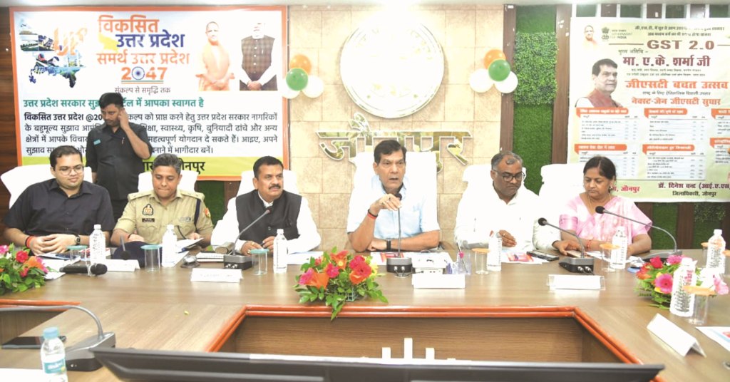 जौनपुर। प्रभारी मंत्री ए.के.शर्मा ने राज्यमंत्री गिरीश चन्द्र यादव, सांसद सीमा द्विवेदी, नगर पालिका परिषद अध्यक्ष मनोरमा मौर्या, जिलाध्यक्ष पुष्पराज सिंह की उपस्थिति में कलेक्ट्रेट सभागार में आयोजित संवाद कार्यक्रम के दौरान व्यापारियों से मुलाकात कर जीएसटी कर सुधारों पर चर्चा की। प्रभारी मंत्री ने बताया कि जीएसटी की दरों में सुधार कर दैनिक आवश्यक वस्तुओं पर बडी बचत, स्वास्थ्य सेवा क्षेत्र में राहत, सस्ती शिक्षा किसानों और कृषि को बढावा, ऑटोमोबाइल के क्षेत्र में भारी छूट और इलेक्ट्रानिक उपकरणों पर बचत सुनिश्चित की है। जीएसटी की दरों में कमी से व्यापारिक गतिविधियों में तेजी आएगी, बाजार को नई ऊर्जा मिलेगी और रोजगार के अवसरों में वृद्धि होगी। प्रभारी मंत्री ने व्यापारियों से अपील किया कि वे स्वदेशी उत्पादों को प्राथमिकता दें और आत्मनिर्भर भारत के संकल्प को आगे बढ़ाएं। उन्होंने कहा कि स्थानीय व्यापार को मजबूत करने से न केवल जिले की अर्थव्यवस्था को मजबूती मिलेगी बल्कि देश की प्रगति में भी योगदान होगा। कार्यक्रम में उपस्थित व्यापारियों ने मंत्री के विचारों का स्वागत किया। इसके उपरान्त प्रभारी मंत्री ने किसानों को नि:शुल्क मटर बीज मिनी किट का वितरण किया गया। इस अवसर पर जिलाधिकारी डॉ.दिनेश चंद्र, पुलिस अधीक्षक डॉ.कौस्तुभ, मुख्य विकास अधिकारी ध्रुव खाड़िया, उपायुक्त प्रशासन सुरेन्द कैथल, उपायुक्त राज्यकर अक्षयलाल, सहायक आयुक्त राहुल कुमार राय, सहायक आयुक्त संतोष तिवारी सहित अन्य उपस्थित रहे।