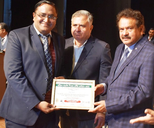 जौनपुर धारा, खेतासराय। जनपद के सरायख्वाजा थाना क्षेत्र अंतर्गत स्थित पोटरिया गांव निवासी डॉ. आसिफ उमर को अखिल भारतीय शिक्षक वार्षिक सम्मेलन 2022 में जामिया मिल्लिया इस्लामिया के टीचर्स एक्सीलेंस अवॉर्ड से सम्मानित किया गया जिससे शुभ-चिंतकों में खुशी की लहर दौड़ गई। यह सम्मान शिक्षक कल्याण फाउंडेशन और जन सेवा समिति द्वारा आयोजित कार्यक्रम में भारत सरकार में कानून राज्यमंत्री प्रोफेसर सत्य पाल सिंह बघेल ने सम्मानित किया है। कार्यक्रम में मुख्य विषय- राष्ट्रीय शिक्षा नीति: शिक्षा का वर्तमान परिदृश्य 2025 का जिक्र करते हुए कहा कि हमें चाइना या जापान नहीं बल्कि भारत बनने पर जोर देना होगा और उस दिशा में मेहनत करनी होगी। हमें एक बार फिर से चाणक्य का भारत बनाना होगा। उन्होंने आगे कहा कि जामिया और देश के अन्य प्रतिष्ठित संस्थान को महत्वपूर्ण शिक्षकों के प्रयास से ही लगातार उपलब्धियां मिल रही हैं। उन्होंने शिक्षक की भूमिका पर प्रकाश डालते हुए कहा कि एक शिक्षक के मन में किसी भी प्रकार का द्वेष नहीं होना चाहिए, चाहे वह जाति, रंग व धर्म के आधार पर हो। एक कक्षा में सभी बच्चों को समान नजरिये से देखना चाहिए। कार्यक्रम में मौजूद बच्चों और उनके अभिभावकों से आग्रह किया कि अपनी सैलरी को शिक्षा की तरफ खर्च करें क्योंकि इससे ही हम बेहतर भविष्य की उम्मीद कर सकते हैं। कार्यक्रम में भारत सरकार के ग्रामीण विकास राज्यमंत्री फग्गन सिंह, भारत सरकार के शिक्षा मंत्रालय के एडिशनल सेक्रेटरी और आईएएस सन्तोष यादव ने सम्बोधित किया। इस अवसर पर देशभर के शिक्षाविद और अलग-अलग हिस्सों से आएं शिक्षकों और छात्र-छात्राओं को भी सम्मानित किया गया। जिसके कड़ी में उक्त थाना क्षेत्र के अंतर्गत स्थित पोटरिया गांव निवासी डॉ. आफिस उमर जामिया को एक्सीलेंस अवॉर्ड से नवाजा गया। इस शिक्षक सम्मेलन का संचालन नेशनल कन्वेनर जगदीश कुमार विज ने किया।