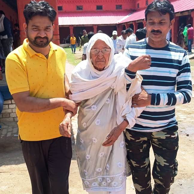 वृद्ध को मतदान केंद्र तक ले जाते परिजन