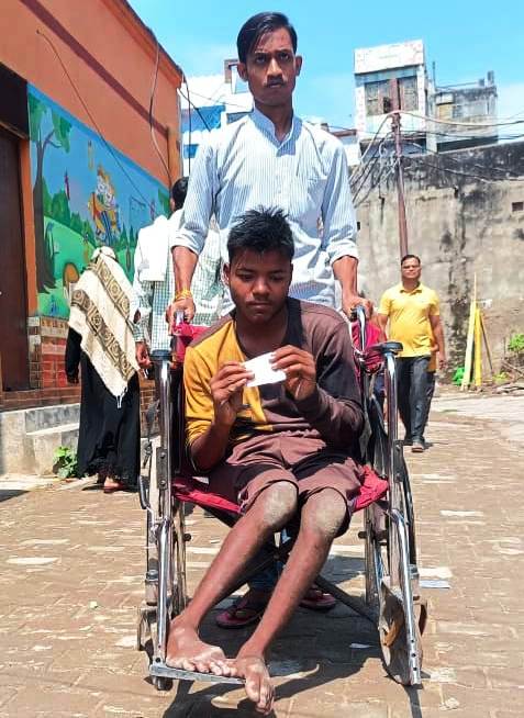 दिव्यांग युवक को मतदान केंद्र तक ले जाता युवक