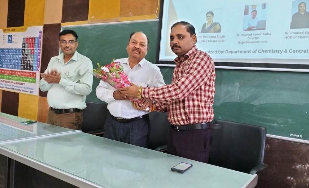 जौनपुर धारा, जौनपुर। वीर बहादुर सिंह पूर्वांचल विश्वविद्यालय परिसर स्थित प्रोफेसर राजेंद्र सिंह(रज्जू भैया) भौतिकीय विज्ञान अध्ययन एवं शोध संस्थान के रसायन विज्ञान विभाग एवं सेंट्रल ट्रेनिग व प्लेसमेंट के तत्वावधान में एकेडमिक इंडस्ट्री इंटरेक्शन के अंतर्गत ‘कार्बन ब्लैक में रोजगार की संभावना’ विषय पर व्याख्यान आयोजित किया गया। व्याख्यान के मुख्य वक्ता कॉन्टिनेंटल कॉर्बन इंडिया के सदानंद पाठक ने कार्बन ब्लैक के बनने की प्रक्रिया से लेकर विभिन्न उपयोगों पर विस्तार से प्रकाश डाला। वक्ता ने बताया कि प्लेन से लेकर साइकिल के टायर में कार्बन ब्लैक का प्रयोग होता है। उन्होंने बताया की कॉर्बन ब्लैक की गुणवत्ता नौ ग्रेड पर मापी जाती है। भारत में सात ग्रेड के कार्बन ब्लैक बनते है। इनका उपयोग पेंट उद्योग में, इंक में  तथा अन्य जगह पर रंजक के रूप में होता है। इस अवसर पर रज्जू भैया संस्थान के निदेशक डॉ.प्रमोद कुमार यादव ने मुख्य अतिथि को अंगवस्त्रम व पुष्प गुच्छ भेंट कर स्वागत किया। रसायन विभाग के विभागाध्यक्ष डॉ.प्रमोद कुमार ने स्वागत उद्बोधन दिया तथा कहा की विभाग निरंतर विद्यार्थियों के सम्पूर्ण व्यक्तित्व विकास के साथ रोजगार के लिए प्रतिबद्ध है। व्याख्यान का संचालन एमएससी के छात्र मंजीत गुप्ता व हर्ष प्रताप सिंह ने किया। धन्यवाद ज्ञापन रसायन विभाग के डॉ.नितेश जायसवाल ने किया। इस अवसर पर डॉ.मिथिलेश यादव, डॉ.दिनेश वर्मा, डॉ.विजय शंकर पाण्डेय व सभी छात्र छात्राएं उपस्थित थे।