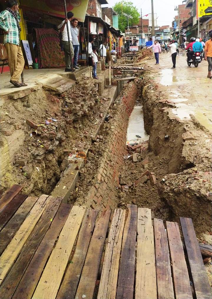 कुछ दिन पूर्व बनी नाली पहली बरसात होते ही गिरी