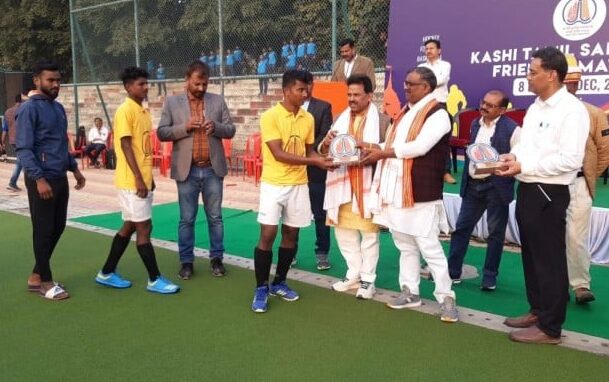 काशी तमिल संगमम के तहत बृहस्पतिवार को बीएचयू के एंफीथिएटर खेल मैदान स्थित एस्ट्रोटर्फ कोर्ट पर काशी तमिल मैत्री मैच खेल मंत्री के इंतजार में अपने निर्धारित समय 1:30 बजे से 40 मिनट की देरी यानी 2:10 बजे शुरू हुआ। मैच करीब डेढ़ घंटे तक चला लेकिन इस बीच भी मंत्री नहीं पहुंचेे। उद्घाटन मैच जब खत्म हुआ तब मंत्री पहुंचे।