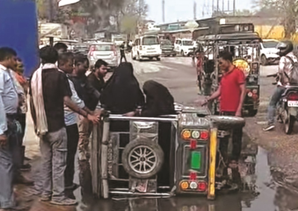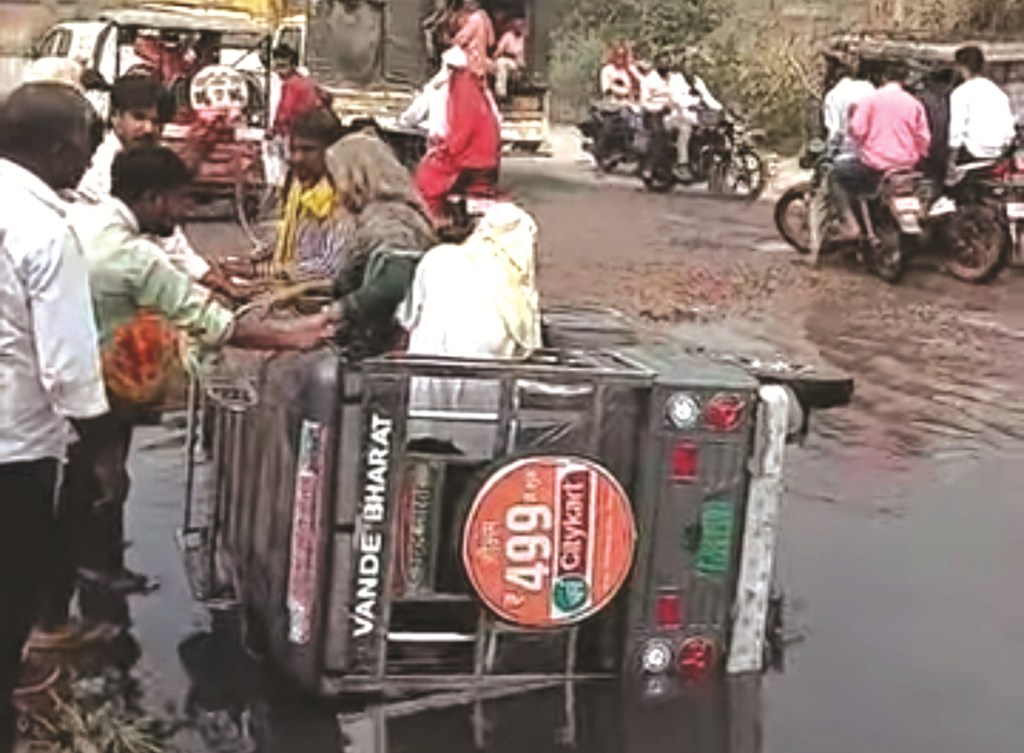 अचानक गहरे गड्ढे में पहिया जाने से ई-रिक्शा का संतुलन बिगड़ गया और वह पलट गया। घटना के बाद मौके पर अफरा-तफरी मच गई और आसपास के लोग तुरंत मदद के लिए दौड़ पड़े। स्थानीय लोगों का आरोप है कि मारुति एजेंसी के सामने सड़क लंबे समय से टूटी हुई है और उसमें बड़े-बड़े गड्ढे बने हुए हैं। बारिश और आसपास के मकानों-दुकानों का पानी उसी गड्ढे में भर जाता है, जिससे यह स्थान हमेशा जलभराव का शिकार रहता है। इसके चलते यहां आए दिन वाहन फंसने और दुर्घटनाएं होने की घटनाएं सामने आती रहती हैं। रविवार की घटना का वीडियो भी कुछ लोगों ने बनाकर सोशल मीडिया पर वायरल कर दिया। लोगों ने प्रशासन और संबंधित विभाग से सड़क की तत्काल मरम्मत कराए जाने की मांग की है। स्थानीय नागरिकों का कहना है कि लगातार हादसे होने के बावजूद विभागीय अधिकारी अब तक कोई ठोस कदम नहीं उठा रहे हैं, जिससे लोगों में रोष बढ़ता जा रहा है।