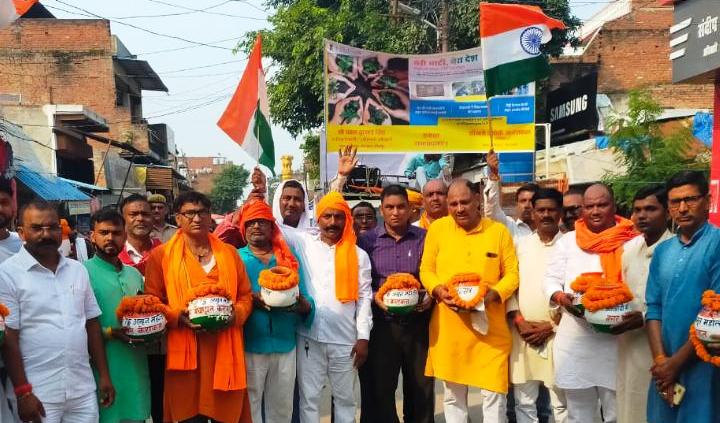 जौनपुर धारा, जौनपुर। केराकत नगर पंचायत में भाजपा जिला उपाध्यक्ष बृजेश सिंह नें भाजपा के पदाधिकारियों एवं कार्यकर्ताओं के साथ मेरी माटी मेरा देश कार्यक्रम के अंतर्गत केराकत नगर पंचायत के 11वार्डों में कलश यात्रा निकालकर नगर वासियों से अक्षत के रुप में चावल तथा मिट्टी को संचित किया गया। इस मौके पर जिला उपाध्यक्ष बृजेश सिंह नें कहा कि देश हित में भूमिका निभानें वाले राष्ट्र प्रेमियों के घर से मिट्टी लीजा रही है। दिल्ली के कर्तव्य पथ पर बननें वाले अमृत वाटिका में गाँव के सभी स्वतंत्रता सेनानीयों एवं शहीदों के साथ-साथ आम जनता के आंगन की मिट्टी का प्रयोग होगा। कार्यक्रम में भाजपा जिला महामंत्री मेहीलाल गौतम, कार्यक्रम के प्रभारी एवं जिला महामंत्री भाजपा अनुसूचित मोर्चा अजय सोनकर शास्त्री, केराकत मण्डल अध्यक्ष संजय सिंह, अधिशासी अधिकारी पवन कुमार सिंह,मण्डल महामंत्री विवेक सिंह, पूर्व मण्डल उपाध्यक्ष केराकत मोहम्मद असलम खाँन, सोशल मीडिया संयोजक कीर्तिमान सिंह, सेक्टर प्रभारी दिलीप सोनकर, आईटी संयोजक अजीत सिंह, सोशल मीडिया संयोजक मण्डल केराकत विश्वजीत, सुरेन्द्र यादव, राजेंंद्र चौधरी, केराकत नगर पंचायत के कम्प्यूटर आपरेटर अमित कुमार साहनी, मिश्रा यादव, असलम मन्सूरी, विनोद यादव, सूरज, पंकज आदि कर्मचारी उपस्थित रहे।