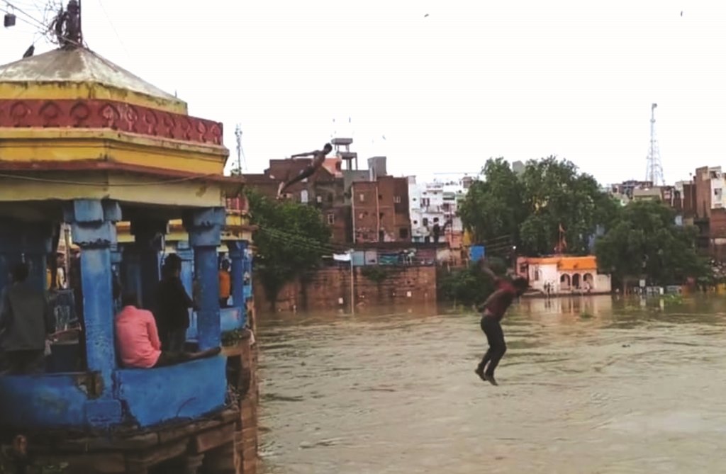 - गोमती के बढ़े जलस्तर पर शाही पुल से छलांग लगा रहे युवक