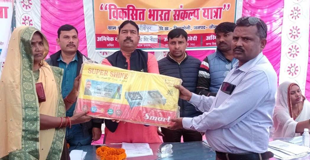 जौनपुर धारा, जफराबाद। विकसित भारत संकल्प यात्रा के तहत रविवार को ग्राम पंचायत बीबीपुर गांव में गोष्ठी का आयोजन कर भारत संकल्प यात्रा की एलईडी वैन के जरिये सरकार की जनहितकारी कार्यो के बारे में विस्तृत जानकारी दी गयी। कार्यक्रम में भाजपा मंडल अध्यक्ष रमेश चन्द्र जायसवाल ने केंद्र सरकार द्वारा संचालित तमाम योजनाओं के पात्र लाभार्थियों को प्रमाण पत्र वितरित किया। वैन के माध्यम से गांव के लोगों को उनके अधिकार व सरकार के द्वारा संचालित विकास कार्यो तथा पात्र व्यक्तियों के क्या अधिकार है उसे भी बताया गया। मंडल अध्यक्ष व ग्राम प्रधान ने उज्वला योजना के अंतर्गत 6 लाभार्थियों को गैस चूल्हा वितरित किया। गोष्ठी को संबोधित करते हुए भाजपा मंडल अध्यक्ष रमेश चंद्र जायसवाल ने कहा कि प्रधानमंत्री नरेंद्र मोदी व मुख्यमंत्री योगी आदित्यनाथ द्वारा जनहित में तमाम योजनाए चलायी जा रही है। योजनाओं से पात्र व्यक्तियों को लाभान्वित करने व उन्हें जानकारी देने के लिए विकसित भारत संकल्प यात्रा कार्यक्रम चलाया जा रहा है।भाजपा सरकार 2047 तक आत्मनिर्भर और विकसित राष्ट्र बनने को लेकर संकल्पित है। इसके लिए फिर एक बार मोदी सरकार का नारा हम सबको एक साथ लगाना है। ग्राम प्रधान वीरेन्द्र सिंह चौहान ने कहा कि संकल्प यात्रा के जरिये गांव के लोगो को योजनाओं के बारे में जानकारी दी जा रही है। साथ ही पात्र लाभार्थियों को लाभान्वित किया जा रहा है। मंडल अध्यक्ष ने ग्राम प्रधान वीरेंद्र सिंह चौहान को प्रधानमंत्री का अभिनंदन पत्र दिया गया। अधिकारियों ने जनता से किसान सम्मान निधि,कोटे के राशन,आवास,पेंशन,आदि के बारे में पूछा।किसी ने किसी प्रकार की शिकायत नही किया।कार्यक्रम की अध्यक्षता एडीओ एजी आशीष त्रिपाठी व संचालन प्रेम नाथ पाठक ने किया। सुंगुलपुर गांव में संकल्प यात्रा कार्यक्रम के तहत सरकार की योजनाओं के बारे में जानकारी दी गयी। प्राथमिक विद्यालय के बच्चो ने अतिथियों के लिए स्वागत गीत गाकर व सरस्वती वंदना कर बच्चो ने सभी का मन मोह लिया। कार्यक्रम की अध्यक्षता ग्राम प्रधान फेरुराम सरोज व संचालन सचिव अभिषेक यादव ने किया। इस मौके पर अरविंद सिंह, अार्या सिंह, पंचम पाल, ग्राम रोजगार सेवक अजय कुमार आनंद, मनबोध पाल, रतन सिंह, चंद्रभान सिंह, बबलू सिंह, शैलेन्द्र सिंह आदि लोग उपस्थित रहे।