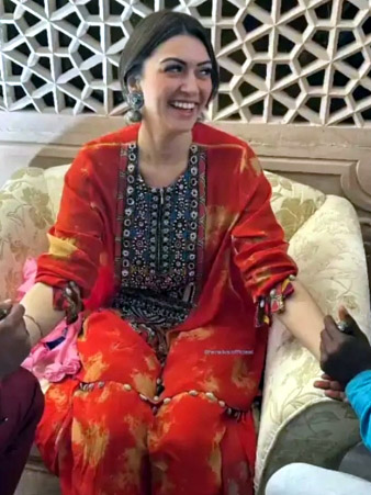 मेहंदी सेरेमनी में हंसिका ऑरेंज कलर के आउटफिट में दिखीं। इसके साथ उन्होंने ऑक्सिडाइज झुमके कैरी किए। कपल की शादी जयपुर के 450 साल पुराने किले में सिंधी रीति-रिवाज से होने वाली है। शादी की रस्में पिछले हफ्ते मुंबई में माता की चौकी के साथ शुरू हुई थीं। हंसिका इस फंक्शन में रेड मिरर वर्क साड़ी में दिखीं। इसके साथ उन्होंने मैचिंग कलर का मांग टीका और ईयररिंग्स भी पहन रखे थे, जिसमें वो बेहद खूबसूरत लग रही थीं। बता दें इस शाही शादी के लिए दोनों दूल्हा-दुल्हन और उनके परिवार जयपुर पहुंच चुके हैं। यहां एयरपोर्ट से वह कार के जरिए मुंडोता फोर्ट गए हैं। आज से शादी की रस्में शुरू हो गयी हैं। आज पहले दिन मेहंदी की रस्म हुई और रात को सिंगिंग का प्रोग्राम होगा। इसके बाद कल 3 दिसंबर को हल्दी और डांस प्रोग्राम होगा। 4 दिसंबर को हंसिका सोहेल के साथ शादी के बंधन में बंध जाएंगी। जयपुर पहुंचने के पहले ग्रीस में ही हंसिका मोटवानी ने अपने दोस्तों के साथ बैचलर पार्टी भी की। इसमें बॉलीवुड की कई अन्य हस्तियां भी उनके साथ रही। गौरतलब है कि इस शादी की तैयारियां राजस्थान में पिछले करीब 2 महीने से चल रही थी। हंसिका भी 2 महीनों में कई बार राजस्थान आ चुकी थी। हंसिका ने कुछ दिन पहले सोशल मीडिया के जरिए कुछ फोटोज शेयर करते हुए अपनी इंगेजमेंट की खबर को कन्फर्म किया था। हंसिका ने प्रâांस के फेमस एफिल टॉवर के सामने की तस्वीर डाली थी, जिसमें सोहेल हाथ में रिंग लिए उन्हें प्रपोज करते दिखाई दे रहे थे। हंसिका ने इन फोटोज को शेयर करते हुए कैप्शन में लिखा, ‘अभी और हमेशा के लिए। सोशल मीडिया पर ये प्रपोजल काफी सुर्खियों में था। हाल ही में खबरें ये भी आई थीं कि हंसिका-सोहेल की शादी डायरेक्ट ध्ऊऊ पर स्ट्रीम होगी। हंसिका के फैंस उनके वेडिंग मोमेंट्स को डायरेक्ट फोन की स्क्रीन पर देख सकेंगे। बीते साल यहां सवाई माधोपुर में बॉलीवुड एक्टर विक्की कौशल और कैटरीना कैफ की शादी हुई थी। इस शादी के ठीक 1 साल बाद राजस्थान एक बार फिर बॉलीवुड की एक शाही शादी का गवाह बनने जा रहा है। यह शादी राजस्थान के जयपुर के मुंडोता फोर्ट में होगी। यह किला करीब 450 साल पुराना है।