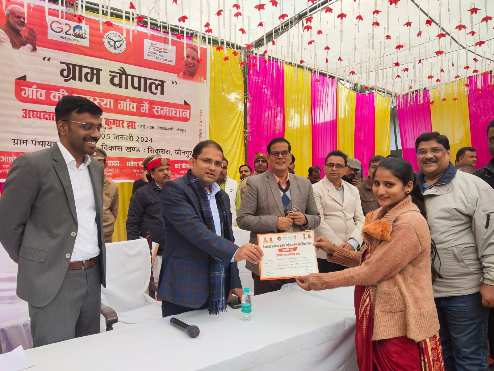 जौनपुर धारा, जौनपुर। जिलाधिकारी अनुज कुमार झा की अध्यक्षता में विकासखण्ड सिकरारा के ग्राम पंचायत गोनापर में ग्राम चौपाल का आयोजन किया गया। जनचौपाल में स्वास्थ्य विभाग, जिला प्रोबेशन विभाग, खाद्य रसद विभाग सहित विभिन्न विभागों के द्वारा अपने विभाग से संबंधित योजनाओं के बारे में विस्तारपूर्वक जानकारी दी गई। इस दौरान विभागों के द्वारा कैंप लगाकर लोगों के आवेदन भी लिए गए। जन चौपाल के दौरान प्रधानमंत्री आवास योजना के 12प्रार्थना पत्र, वृद्धावस्था पेंशन योजना के 11, विधवा एवं दिव्यांग पेंशन के 02-02 और स्वच्छ शौचालय निर्माण के 06, आयुष्मान कार्ड के 19 नए प्रार्थना पत्र प्राप्त हुए। जिलाधिकारी द्वारा सम्बंधित अधिकारियों को प्रार्थना पत्र को हस्तांतरित करते हुए निर्देशित किया गया कि पात्रता की जांच करते हुए पात्रों को लाभ देने का कार्य करें। जन चौपाल मे शौचालय निर्माण की समीक्षा के दौरान जिलाधिकारी ने पाया कि गांव की आबादी के सापेक्ष कम शौचालय का निर्माण हुआ है, जिसपर जिलाधिकारी के द्वारा नाराजगी व्यक्त करते हुए एडीओ पंचायत एवं सचिव को प्रतिकूल प्रविष्टि देने के निर्देश दिए गए। जिलाधिकारी के द्वारा खंड विकास अधिकारी सिकरारा को निर्देशित किया गया कि शौचालय निर्माण के लिए सभी पात्रों का आवेदन लेते हुए आज शाम तक अवगत कराए। गांव में जल जीवन मिशन के तहत बनाई जा रही टंकी का कार्य 10प्रतिशत और पाइपलाइन का कार्य 40प्रतिशत पूर्ण होना बताया गया, जिसपर जिलाधिकारी ने निर्देशित किया गया कि तेजी से कार्य कराते हुए समय से कार्य को पूर्ण कराये। जिलाधिकारी के द्वारा बीएलओ से मृतक सत्यापन, मतदाता शिफ्टिंग के कार्यों के संबंध में जानकारी ली गई। जन चौपाल में डिप्टी आरएमओ नृपुंजय पाठक ने बताया कि धान बेचने के लिए किसान भाई सीएचसी पर रजिस्ट्रेशन 29 फरवरी से पहले कर ले और धान बेचने के संबंध में किसी भी प्रकार की समस्या होने पर उन्हें अवगत कराये। जिलाधिकारी और मुख्य विकास अधिकारी साईं तेजा सीलम के द्वारा सोनी प्रजापति, अनीता, कविता की गोदभराई एवं आशुतोष, सवी का अन्नप्राशन कराया गया। जिलाधिकारी के द्वारा बबीता प्रजापति, शिव देवी, माधुरी सिंह, उर्मिला, आशा, नसीम जहां को उज्ज्वला योजना के तहत गैस चूल्हे का वितरण किया गया। उन्होंने 04 लाभार्थियों को आयुष्मान कार्ड और 10प्रधानमंत्री आवास के लाभार्थियों को चाबी वितरण की। बीसी सखी क्षमता साहू को उत्कृष्ट कार्य करने पर प्रशस्ति पत्र दिया। इस अवसर पर जिला विकास अधिकारी वी.के.यादव, जिला प्रोबेशन अधिकारी विजय कुमार पाण्डेय, जिलापूर्ति अधिकारी संतोष विक्रम शाही, जिला समाज कल्याण अधिकारी नीरज पटेल सहित अन्य जिला स्तरीय अधिकारी एवं कर्मचारीगण उपस्थित रह