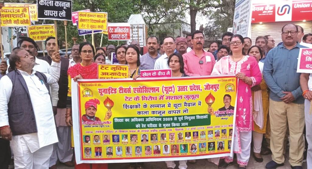 जौनपुर। टीईटी की अनिवार्यता के विरोध में यूनाइटेड टीचर्स एसोसिएशन ने गुरुवार को जिला मुख्यालय पर जबरदस्त प्रदर्शन किया। जिला अध्यक्ष संजय सिंह के नेतृत्व में सैकड़ों शिक्षकों ने रोडवेज तिराहे से मशाल जुलूस निकाला, जो कलेक्ट्रेट परिसर स्थित शहीद स्तंभ पर पहुंचकर सभा में तब्दील हो गया। प्रदर्शनकारियों ने जिलाधिकारी के माध्यम से प्रधानमंत्री को संबोधित एक ज्ञापन सौंपा। सभा को संबोधित करते हुए जिला अध्यक्ष संजय सिंह ने कहा कि जो शिक्षक 10 से 15 वर्षों से सेवा दे रहे हैं, उन पर अब परीक्षा की अनिवार्यता थोपना उनके अनुभव का अपमान है। जिला मंत्री लक्ष्मी नारायण तिवारी ने तर्क दिया कि नियुक्ति के समय यह नियम नहीं था, अत: सेवा के दौरान इसे लागू करना ‘प्राकृतिक न्यायÓ के सिद्धांतों के विरुद्ध है। वरिष्ठ उपाध्यक्ष चंद्रेश यादव ने कहा कि पुराने शिक्षकों को टीईटी से मुक्त रखा जाए ताकि वे मानसिक तनाव के बिना शिक्षा की गुणवत्ता पर ध्यान दे सकें। इस मशाल जुलूस में डॉ. आशीष सिंह, मनीष सिंह, प्रमोद शुक्ला, अजय मिश्रा, विनोद सिंह और श्रीकृष्ण पांडे सहित बड़ी संख्या में शिक्षक व पदाधिकारी मौजूद रहे। शिक्षकों ने चेतावनी दी कि यदि उनकी जायज मांगों पर शीघ्र विचार नहीं किया गया, तो वे भविष्य में और भी उग्र आंदोलन के लिए बाध्य होंगे।