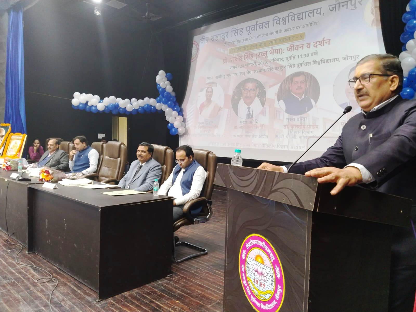 जौनपुर धारा, सरायख्वाजा। वीर बहादुर सिंह पूर्वांचल विश्वविद्यालय स्थित प्रो. राजेंद्र सिंह (रज्जू भैया) भौतिकीय विज्ञान अध्ययन एवं शोध संस्थान के द्वारा प्रो राजेंद्र सिंह (रज्जू भैया) की जन्मजयंती की पूर्व संध्या पर प्रो राजेंद्र सिंह (रज्जू भैया): जीवन एवं दर्शन विषय पर स्मृति व्याख्यान का आयोजन किया गया। इस व्याख्यान के मुख्य अतिथि उत्तर प्रदेश लोक सेवा आयोग के सदस्य प्रो. आरएन त्रिपाठी ने कहा कि प्रो. राजेंद्र सिंह सरलता, सहजता व आत्मीयता के प्रतिमूर्ति थे। इसी कारण लोग प्रो. राजेंद्र सिंह को  की प्यार से रज्जू भैया कहते थे। उन्होंने रज्जू भैया के जीवन के ऊपर विस्तार से प्रकाश डाला। उन्होंने रज्जू भैया के राजनीतिक प्रभाव के बारे में चर्चा करते हुए बताया कि नानाजी देशमुख रज्जू भैया से प्रभावित होकर चित्रकूट में ग्रामोदय का कार्य प्रारंभ किया। व्याख्यान में मुख्य वक्ता के रूप में डॉ. कुलदीप पांडेय ने बताया कि रज्जू भैया बचपन से ही बहुत मेधावी रहे और वह इलाहाबाद विश्वविद्यालय से शिक्षा ग्रहण की तथा वहीं पर भौतिकी विभाग में प्राध्यापक नियुक्त हुए। समाजिक व राष्ट्र कार्य में रुचि के कारण विद्यार्थी जीवन में ही राष्ट्रीय स्वयंसेवक संघ से जुड़े और बाद में राष्ट्रीय स्वयंसेवक संघ के चर्तुथ सरसंघचालक हुए। डॉक्टर पांडे ने बताया की समाज के लिए रज्जू भैया ने अपने पूरा जीवन समर्पित कर दिया तथा मितव्ययता से अपने जीवन को व्यतीत किया। इस अवसर पर ने अतिथियों ने रज्जू भैया संस्थान में स्थित प्रो राजेंद्र सिंह की प्रतिमा पर माल्यार्पण किया। अतिथियों का स्वागत रज्जू भैया संस्थान के निदेशक  प्रो. देवराज सिंह ने किया। व्याख्यान का विषय प्रवर्तन डॉ. नितेश जायसवाल ने किया किया। कार्यक्रम का संचालन विवेक श्रीवास्तव तथा धन्यवाद ज्ञापन शशिकांत यादव ने किया। इस अवसर पर विश्वविद्यालय के आचार्य प्रो. मानस पांडेय, प्रो. विक्रम देव, डॉ. मनोज मिश्र, डॉ. प्रमोद यादव, डॉ. प्रमोद कुमार, डॉ. गिरधर मिश्रा, डॉ. पुनीत धवन डॉ. नीरज अवस्थी, डॉ. श्याम कन्हैया सिंह, डॉ. दिनेश कुमार वर्मा, डॉ. अजीत सिंह और अन्य शिक्षक उपस्थित रहे।