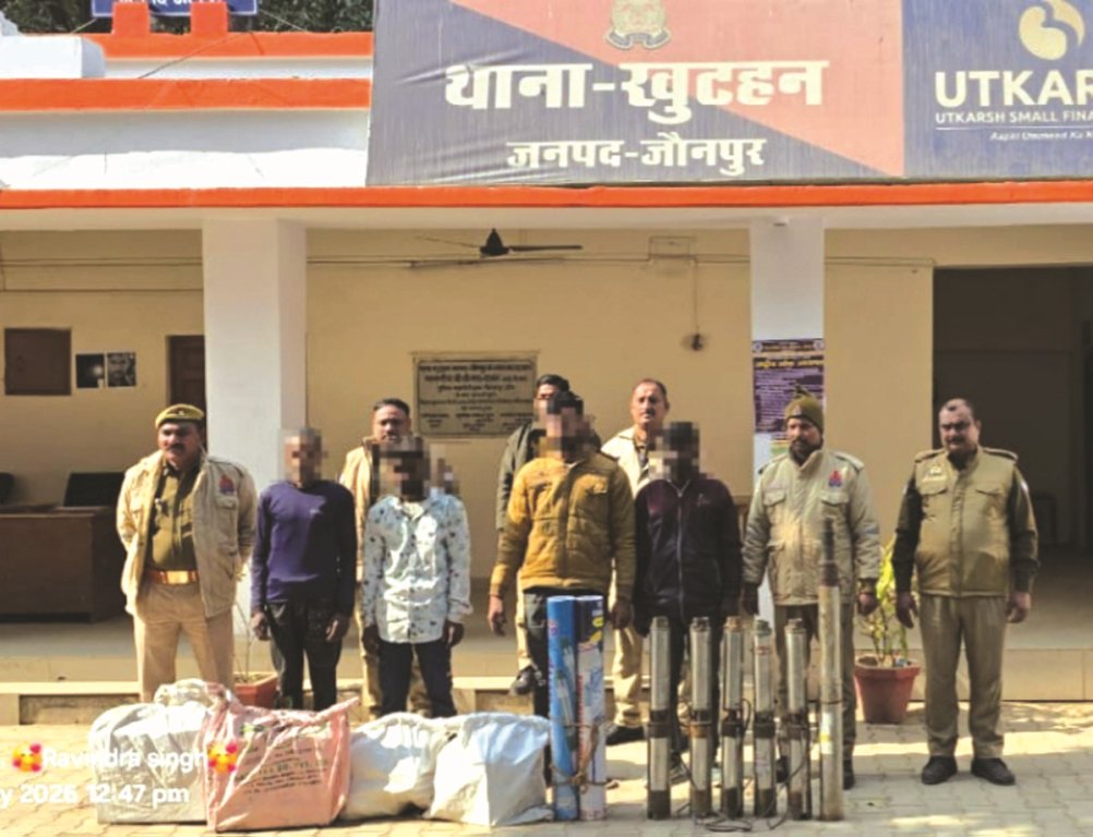 हाल में हुई चोरी की घटनाओं की छानबीन में जुटे थानाध्यक्ष रामाश्रय राय ने लक्ष्मीशंकर चौराहा पर चेकिंग के दौरान मिले सुराग पर शनिवार की रात टीम के साथ धिरौली नानकार गांव में बंद पड़े ईंट भ_ा पर घेराबंदी कर चारों को गिरफ्तार कर लिया। पकड़े गए आरोपितों में सरपतहां थाना क्षेत्र के पट्टी नरेंद्रपुर के प्रिंसू माली, शीतला प्रसाद उर्फ मुन्ना, सुनील व मदारपुर गांव के इंदल गौतम हैं। इनके पास से चोरी की गई दो इन्वर्टर, दो बैटरी, ब्लोअर, फर्राटा पंखा, चार बंडल तांबा का तार, तीन बंडल केबिल, मिक्सर मशीन, दो नए व छह पुराने सबमर्सिबल पंप बरामद हुए। थानाध्यक्ष ने बताया पूछताछ के दौरान प्रिंसू माली ने बताया 5जनवरी की रात मखदूमपुर गांव निवासी गिरोह के सरगना रवींद्र वर्मा ने मुझे, इंदल व सुनील व मुन्ना को मखदूमपुर स्कूल के पीछे बुलाया था। वहां रवींद्र वर्मा, मेरे गांव का शक्तिमान व एक अज्ञात युवक मिला। वहीं से साजिश रचकर पहले बनहरा में टेंट हाउस संचालक सुबाष चंद्र मौर्य की जैकेट व पिकअप चोरी की। इसके बाद पटैला बाजार सब्जी मंडी में सुभाष निगम के सहज जनसेवा केंद्र व अली हसन की इलेक्ट्रानिक्स की दुकान के ताले चटकाकर चोरी की। चोरी किए गए सामानों को लाकर कमरे में छिपाकर रख दिया था। बाकी सामान रवींद्र, शक्तिमान व अज्ञात युवक पिकअप सहित लेकर चले गए थे। कमरे में रखे सामान शाहगंज ले जाकर बेचने जाने के लिए एकत्र होने पर गिरफ्तार कर लिए गए। इंदल गौतम ने प्रिंसू माली के साथ मिलकर शेख अशरफपुर गांव स्थित बजरंग बली मंदिर से 21 दिसंबर को चोरी किया गया लाउडस्पीकर व एंपलीफायर फेरी लगाकर कबाड़ खरीदने वाले को 1500 रुपये में बेचना स्वीकार किया। थानाध्यक्ष ने रवीद्र वर्मा, शक्तिमान व तीसरे अज्ञात की तलाश की जा रही है। दोनों बाइकों को सीज कर दिया गया है। छानबीन में पल्सर बाइक आजमगढ़ जिले के अतरौलिया थाना के भरौली की रीना व स्प्लेंडर प्लस बाइक सुलतानपुर के लंभुआ थाना के कुबेर शाह पट्टी निवासी प्रेमनाथ के नाम पंजीकृत है। इंदल के विरुद्ध खुटहन, सरपतहां व देवरिया जिले के भाटपार रानी थानों में चोरी, गो-वध निवारण व गैंग्स्टर एक्ट सहित छह जबकि सुनील के विरुद्ध तीन मुकदमे दर्ज हैं। गिरफ्तारी करने वाली टीम में उपनिरीक्षक रवि प्रकाश, महेंद्र यादव, हेड कांस्टेबल राम निवास यादव, अनिरुद्ध यादव, कांस्टेबल सुरेंद्र वर्मा, रण विजय यादव, कुलदीप गोस्वामी व सोनू यादव रहे।