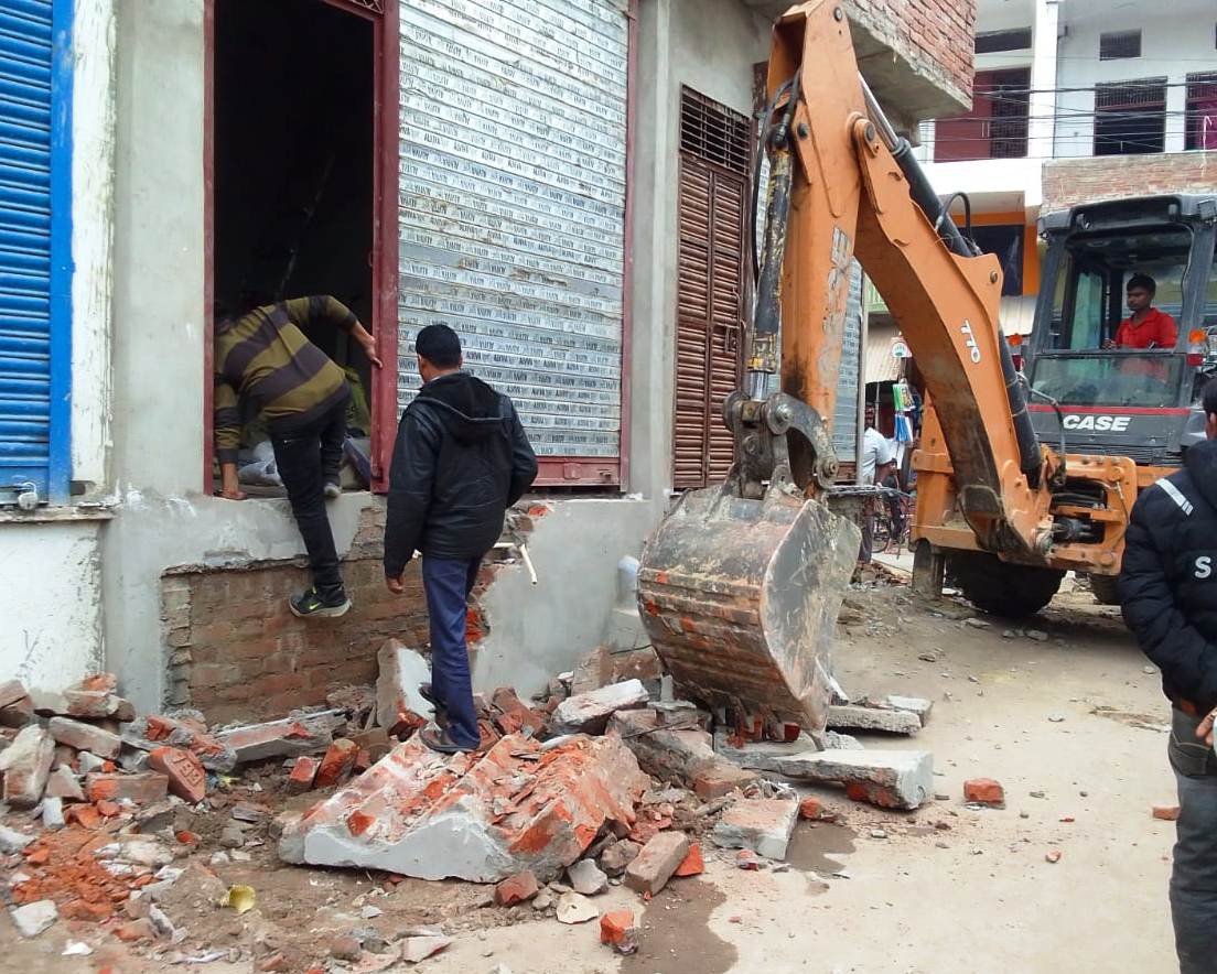 मुंगराबादशाहपुर नगर के पुरानी सब्जी मंडी मोहल्ले में कुछ लोगों द्वारा नाली से भी आगे बढ़कर निर्माण कराया गया था। जिसे हटवाने के लिए नगर पालिका प्रशासन द्वारा अवैध निर्माण हटाए जाने का निर्देश जारी किये जाने के बाद भी स्थिति यथावत बनी रही। पालिका प्रशासन ने कई बार नोटिस भेजा लेकिन अतिक्रमण को नहीं हटाया गया। जिसके कारण बुधवार को पुलिस मौजूदगी में नगर पालिका प्रशासन द्वारा बुल्डोजर लगा कर अवैध निर्माण को जमींदोज कर दिया गया। नगर में बुलडोजर गरजने से लोगों में हड़कंप मचा रहा। इस अवसर पर नगर पालिका परिषद मुंगराबादशाहपुर के अधिशासी अधिकारी अखिलेश तिवारी, अवर अभियंता शिवा नन्द वास्को, राजस्व निरीक्षक रामानुज शुक्ला, लिपिक ज्ञान प्रकाश पटेल, सफाई नायक होरी लाल सहित नगर पालिका के अन्य कर्मचारी मौजूद रहे।