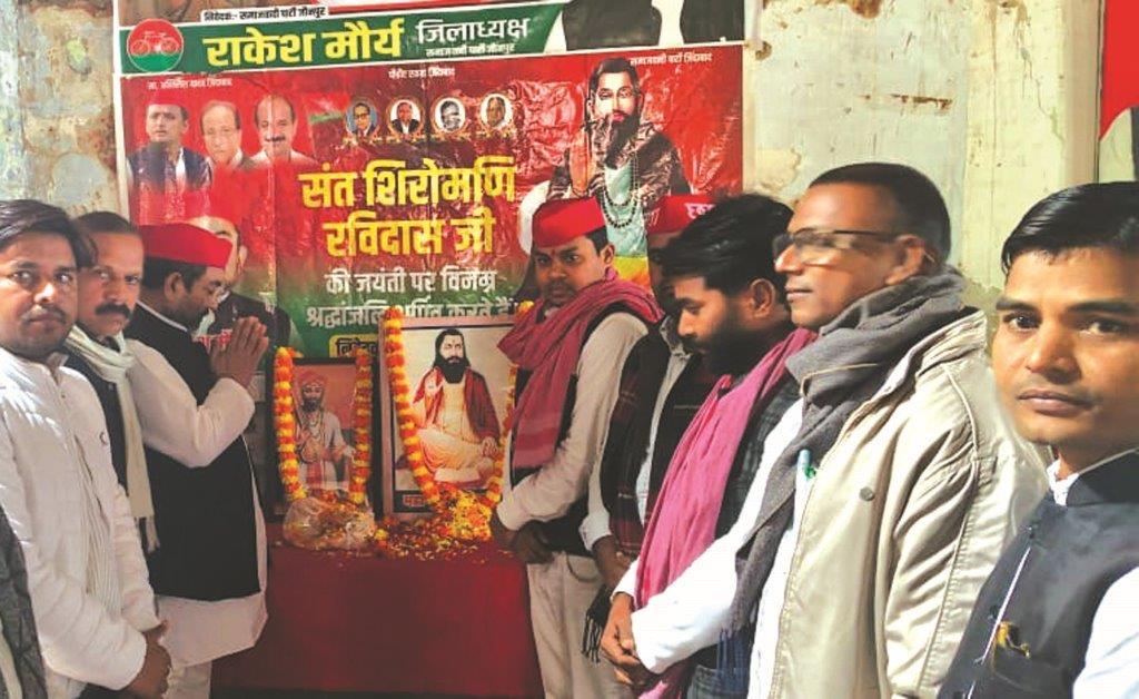 जौनपुर। समाजवादी पार्टी के राष्ट्रीय अध्यक्ष अखिलेश यादव के निर्देशानुसार समाजवादी पार्टी के तत्वाधान में समाजवादी पार्टी के जिला कार्यालय सदर चुंगी अल्फस्टीनगंज में प्रात: 10बजे संत शिरोमणि रविदास एवं संत शिरोमणि न हरिदास महाराज जी सोनार की जयंती समारोह पूर्वक मनाई गई। इस अवसर पर सर्वप्रथम दोनों महापुरुषों के चित्र पर पुष्प अर्पित कर नमन किया गया। गोष्ठी की अध्यक्षता करते हुए जिला अध्यक्ष राकेश मौर्य ने कहा कि संत शिरोमणि रविदास और संत शिरोमणि नरहरि दास सोनार का संपूर्ण जीवन विश्व को जातिवाद, ऊंच नीच, भेदभाव का घोर विरोध करता रहा। दोनों संतों ने श्रम के महिमाकर और अपने जीवन को तथा सोनार के पेशे को आध्यात्मिक प्रतीकों के रूप में प्रयोग किया जैसे शरीर को अंगीठी और आत्मा को सोना बताया। गोष्ठी को जि़ला उपाध्यक्ष हीरालाल विश्वकर्मा, जि़ला सचिव गामा सोनकर, प्रदेश सचिव महिला सभा ऊषा जायसवाल, लाल मोहम्मद राईनी, वीरेंद्र यादव, निज़ामुद्दीन अंसारी आदि ने संबोधित किया। गोष्ठी में मुख्य रूप से हिसामुद्दीन शाह, जि़ला सचिव संतोष मौर्य मुन्ना, हवलदार चौधरी, रत्नाकर चौबे, श्रवण जायसवाल, दीपक विश्वकर्मा, साहबलाल गौतम, सोनी सेठ, रवि यादव कृष्णकांत बिंद, धीरज बिंद, धर्मेंद्र सोनकर, राजेश यादव, नंदलाल यादव, शकील अहमद, राहुल त्रिपाठी, दिलीप प्रजापति, सुनील वासुदेव यादव, आसिफ शाह, पूनम यादव, राधिका यादव, शिवांगी यादव, रविन्द्र मौर्य, अमजद अंसारी रियाज खान, सहित अन्य पदाधिकारी गण मौजूद रहे।