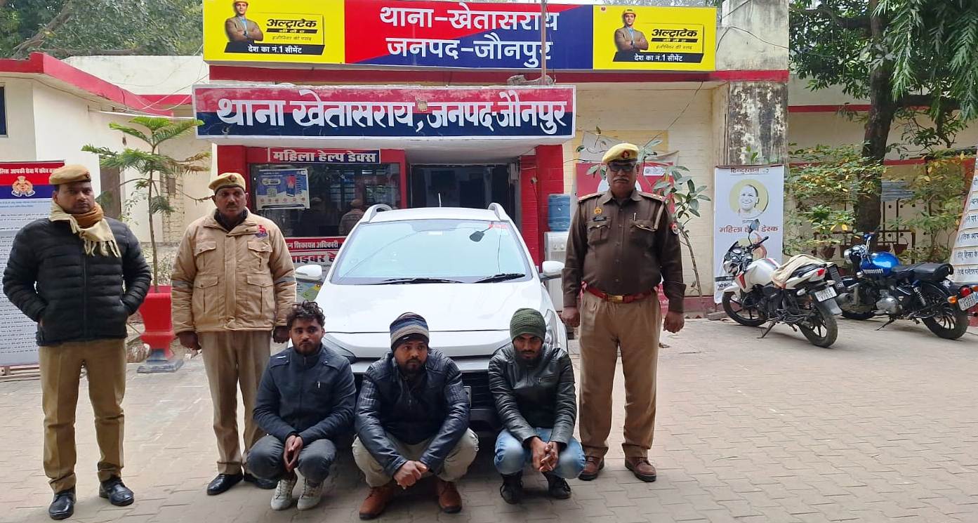 जौनपुर धारा, खेतासराय। अपराध एवं अपराधियों के खिलाफ चलाएं जा रहे अभियान क्रम में खेतासराय पुलिस टीम ने बुधवार की शाम चेकिंग के दौरान तीन तस्करों को प्रतिबंधित मांस के साथ गिरफ्तार कर लिया। जबकि मौके से दो तस्कर भागने में सफल रहे। गिरफ्तार अभियुक्तों को थाने लाकर विधिक कार्यवाही करते हुए चालान न्यायालय भेज दिया। थानाध्यक्ष त्रिवेणी सिंह ने बताया कि अपराधियों के खिलाफ चलाएं जा रहे अभियान के क्रम में पुलिस टीम के साथ बुधवार की शाम क्षेत्र स्थित भदैला बैरियर के पास चेकिंग की जा रही थी। इसी दौरान एक संदिग्ध कार दिखाई देने पर रोक लिया गया। चेकिंग के दौरान कार में लदा प्रतिबन्धित मांस बरामद हुआ। इसी बीच तीन को पकड लिया गया। जबकि दो मौका पाकर भाग लिए। थानाध्यक्ष ने बताया कि गिरफ्तार अभियुक्तों में रिजवान अहमद पुत्र इसरार अहमद, मो.तारिक पुत्र मो.शाहिद, मो.नदीम पुत्र सलीम निवासीगण एराकियाना थाना शाहगंज है। भागने वालों में तहजीम पुत्र नसीम अहमद निवासी रानीमऊ व नूर मोहम्मद पुत्र फखरे आलम निवासी बंजारेपुर थाना गौराबादशाहपुर बताया गया। गिरफ्तार अभियुक्तों के पास एक अदद कार बरामद हुआ। जिस पर 65किलों प्रतिबन्धित मांस बरामद हुआ। गिरफ्तार अभियुक्तों को थाने लाकर गोवध निवारण अधिनियम सहित सुसंगित धाराओं में चालान न्यायालय भेज दिया गया।