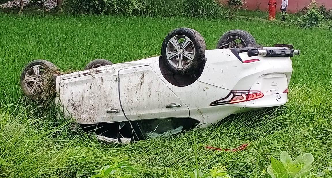 जौनपुर धारा, खेतासराय। स्थानीय क्षेत्र के बादशाही पेट्रोल पंप के बगल में बाइक सवार को बचाने के चक्कर में शनिवार को सुबह कार खाई को पार कर खेत में पलट गई जिसके चारों पहिया ऊपर हो गई हालांकि पलटी कार सवार मामूली रूप से ही चुटहिल हैं। पंडितदीन दयाल नगर निवासी अकील अहमद बाबू उत्तर प्रदेश कांग्रेस कमेटी के पीसीसी सदस्य व किसान कांग्रेस कमेटी उत्तर प्रदेश उपाध्यक्ष अपनी बहन के साथ अंबेडकर नगर जिले में स्थित मखदूम साहब मजार से दर्शन कर लौट रहे थे की उक्त स्थान पर बाइक सवार को बचाने के चक्कर में कार सड़क के किनारे खाई से होते हुए धान के खेत में जाकर इस तरह पलटी कि चारो पहिए ऊपर हो गए। इसमें दोनों भाई बहन को मामूली चोट आई है। यह घटना लगभग सात बजे की है। बाद में स्थानीय डॉक्टर से प्राथमिक इलाज लेकर दूसरी गाड़ी से घर को चले गए वहीं बाइक सवार भी मौका पाकर मौके से फरार हो गया।