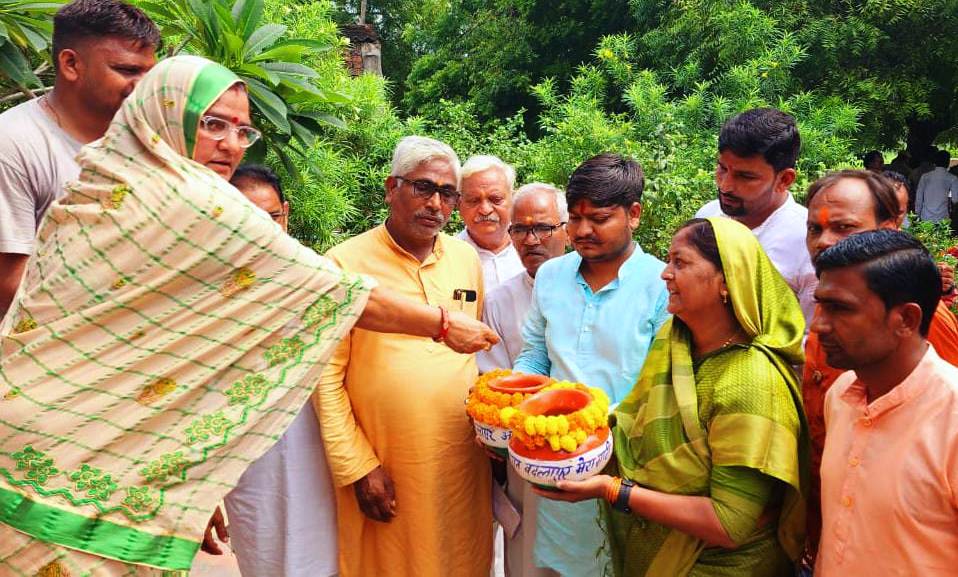 जौनपुर धारा, बदलापुर। भाजपा के राज्य सभा सांसद सीमा द्विवेदी ने चेयरमैन प्रतिनिधि वैभव सिंह सहित भाजपाइयों के साथ बदलापुर नगर पंचायत के विभिन्न वार्डों में पहुंचकर ‘मेरी माटी मेरा देश’ के तहत अक्षत के रुप में चावल तथा मिट्टी को संचित किया गया। वही सासंद ने शपथ दिलाई कि वार्ड में स्थित भगवान भोलेनाथ के मंदिर पर पौधरोपण किया। उधर चेयरमैन प्रतिनिधि वैभव सिंह ने गाजे-बाजे व अपने कार्यकर्ताओं के साथ भलुआही, सरोखनपुर, हकारपुर, पुरानी बाजार, बरौली आदि वार्डों में डोर-टू-डोर पहुंचकर चावल एवं मिट्टी एकत्र किया। इस अवसर पर रामसहाय पाण्डेय, आरके उपाध्याय, माणि तिवारी, बबलू पाण्डेय, विनोद शर्मा, साहबलाल चौधरी, मोहित सिंह आदि उपस्थित रहे।संचालन मिथिलेश सिंह ने किया।