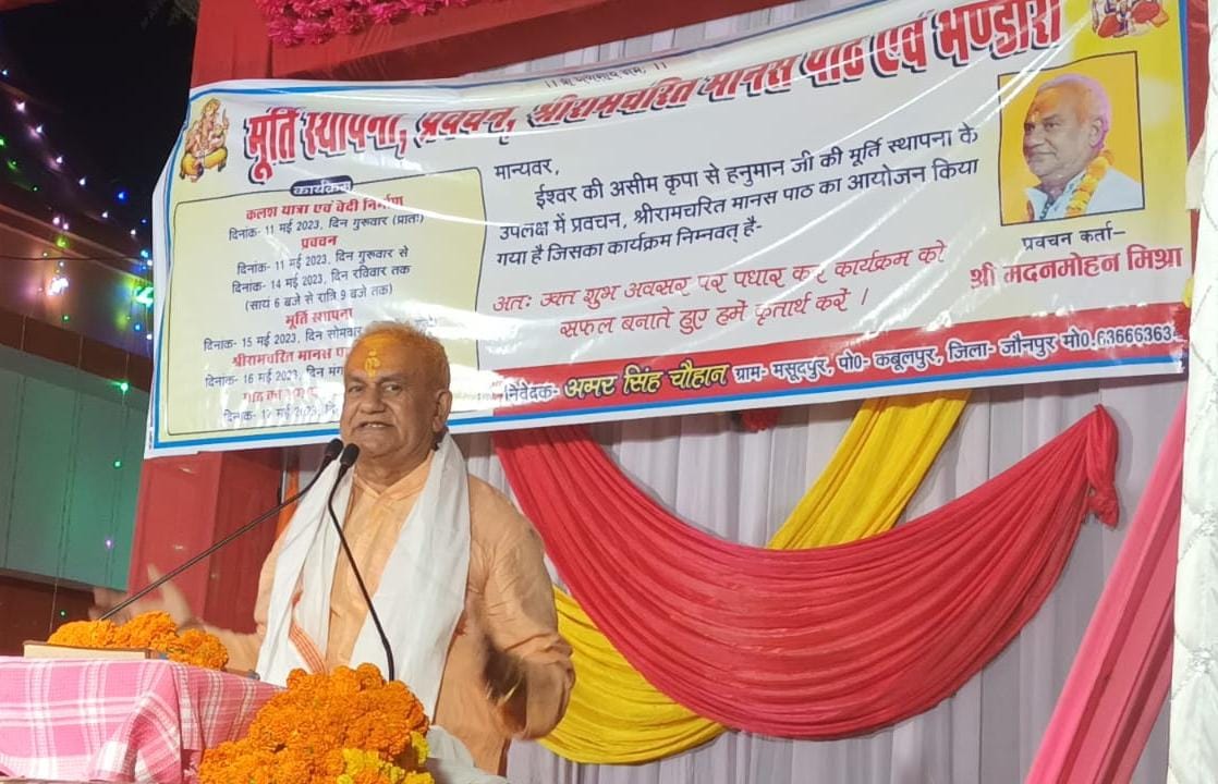 जौनपुर धारा, जफराबाद। काशी से पधारे मानस कोविद डा. मदनमोहन मिश्र ने कहा कि श्रीराम चरित मानस केवल धर्मग्रंथ ही नहीं बल्कि मानव जीवन की आचार संहिता है। वह शुक्रवार को मशऊदपुर, कबूलपुर में प्रवचन कर रहे थे। कहा कि हम जटायु से सीख सकते हैं कि कैसे जीना चाहिए। कागभुसुंडि से जान सकते हैं कि कैसे जीना चाहिए। भगवान श्री राम केवट से नाव मांगते हैं इंद्र से रथ नहीं मांगते। इसका तात्पर्य है कि बड़ों का अहंकार और छोटों की दीनता जब समाप्त हो जाएगी तभी रामराज्य का प्रारंभ होगा। रावण का राज डर पर जबकि श्री राम का प्रेम पर आधारित है। श्री राम कहते हैं कि गुरु के चरणों की कृपा से ही मैंने राक्षसों का संहार किया। दशरथ का शासन वशिष्ठ के अनुशासन में, अशोक का शासन बुद्ध के अनुशासन में, चंद्रगुप्त का शासन चाणक्य के अनुशासन में, शिवाजी का शासन समर्थ स्वामी रामदास के अनुशासन में रहा। प्रभु श्री राम ने भक्ति और ज्ञान के वर्णन में कहा कि भक्ति करने वाला कोई भी प्राणी हमको बहुत प्रिय है। सबसे बड़ा सुख सत्संग है  व सबसे बड़ा दुख दरिद्रता है। मनुष्य सबसे दुर्लभ शरीर है जिससे भवसागर को पार करके परमात्मा को आसानी से पाया जा सकता है। इसके पूर्व नवनिर्मित हनुमान मंदिर में मूर्ति की प्राण प्रतिष्ठा के निमित्त विजय शंकर पाठक के आचार्यात्व में विधिविधान से पूजन कार्य संपन्न हुआ। आयोजक इंद्रसेन सिंह चौहान ने आभार जताया। इस मौके योगेश श्रीवास्तव, रोमी श्रीवास्तव, अंकित श्रीवास्तव आदि लोग उपस्थित रहे।