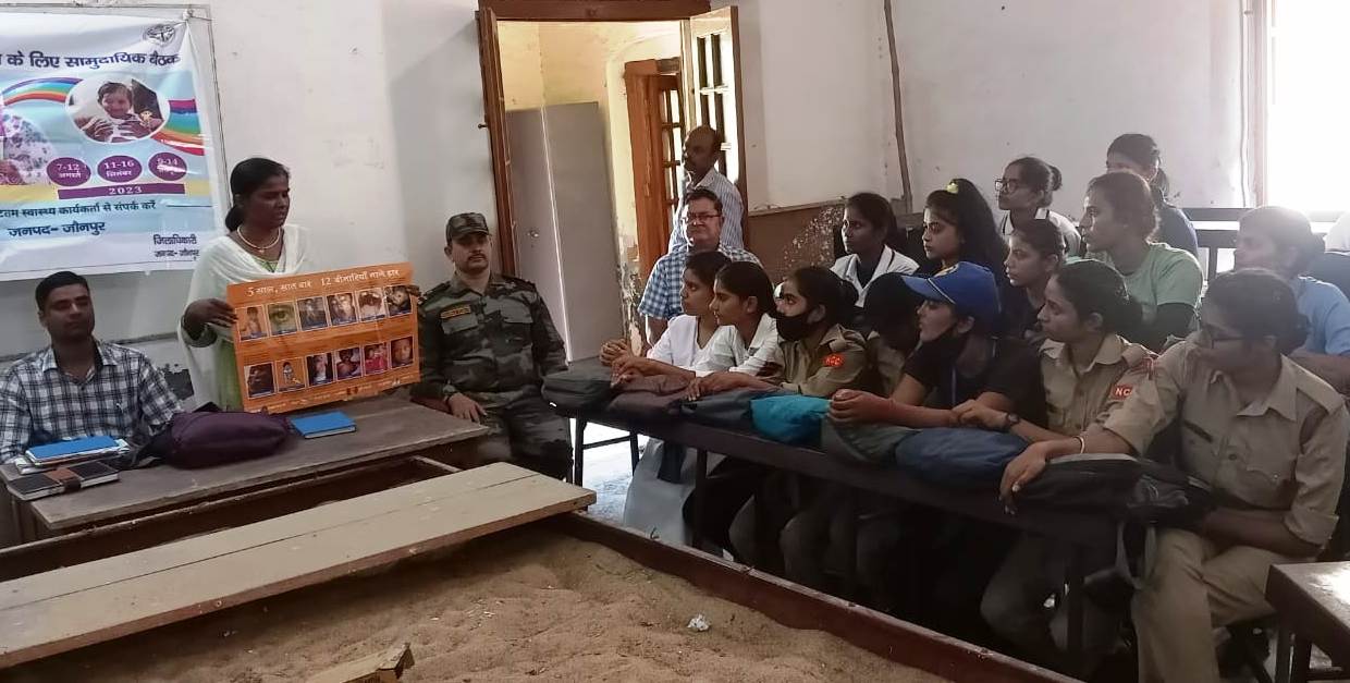जौनपुर धारा, जौनपुर। शुक्रवार को सघन मिशन इंद्रधनुष अभियान 0.5 को सफल बनाने हेतु टी.डी.पी.जी.कॉलेज सभागार में एन.सी.सी. कैडेट के सभी बच्चों ने 5 यू.पी.आई.कंपनी एन.सी.सी. 98 बटालियन एवं 96 को गर्भवती एवं 0-5 साल के बच्चो को 12 जानलेवा बीमारियों जैसे टीबी, पोलियो, डायरिया, काली खांसी, गलघोटू, टिटनेस, हीब, हेपेटाइटिस बी, खसरा रूबेला गंभीर निमोनिया एवं दिमागी बुखार जैसे बीमारियों से कैसे बचाया जा सके। इसके लिए एनसीसी के बच्चो के द्वारा संघन मिशन इंद्रधनुष अभियान 0.5 मे सहयोग करने हेतु अर्बन नोडल प्रवीण पाठक प्रभारी चिकित्सा अधिकारी डॉ.पवन यादव, बीएमसी शाहिद अली,  मो.शकीर एवं शीला के द्वारा किया गया।