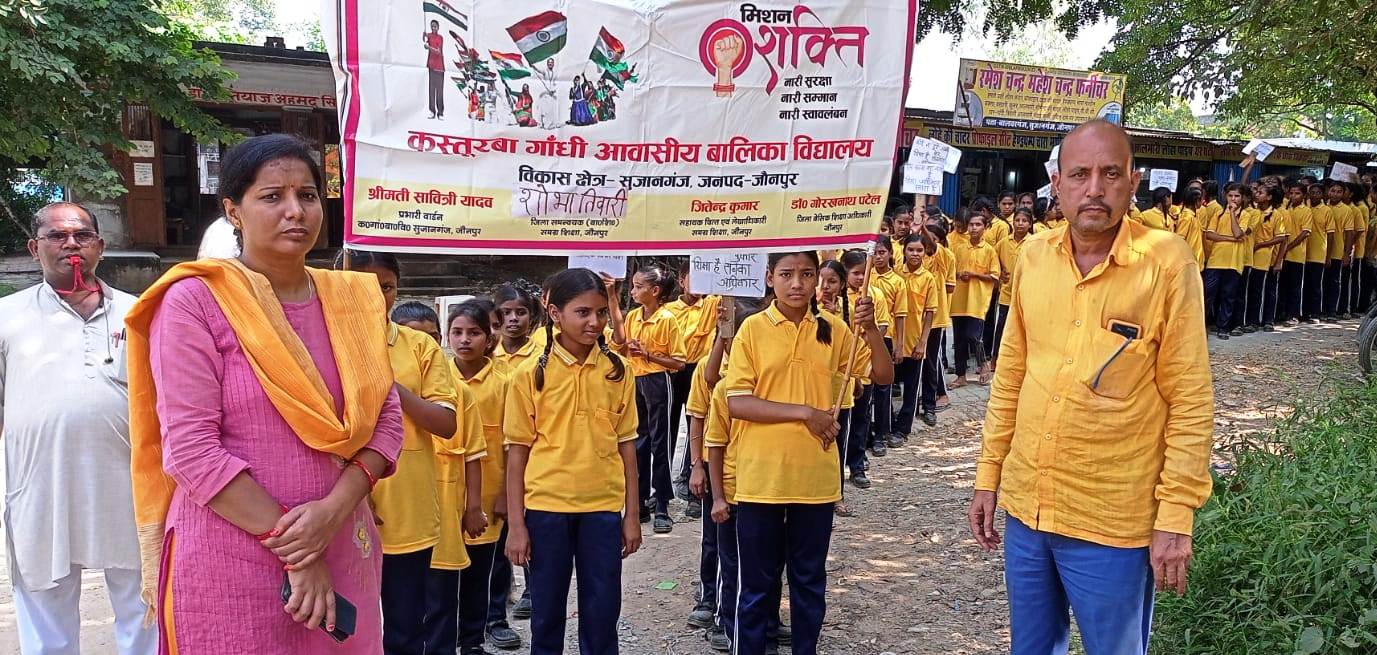 जौनपुर धारा, सुजानगंज। मिशन शक्ति के अंतर्गत उ.प्रा.विद्यालय सुजानगंज और कस्तूरबा गाँधी आवासीय बालिका विद्यालय सुजानगंज के तत्वाधान मे खण्ड शिक्षा अधिकारी अरविन्द पाण्डेय की अध्यक्षता मे नारी सशक्तिकरण पर प्रभात फेरी निकाली गयी। जिसमें खण्ड शिक्षाधिकारी अपने सम्बोधन में बताया कि नारी शक्ति के आगे आने से ही देश का सर्वांगीण विकास संभव है। उन्होंने अभिभावकों से आह्वान किया कि सभी अभिभावक अपने बच्चियों को नियमित विद्यालय भेजे, प्रभात फेरी सुजानगंज थाने से होते हुए बालवरगंज बाजार से होते हुए। विद्यालय परिसर में समाप्त हुई। प्रभात फेरी में बच्चो के साथ उच्च प्राथमिक विद्यालय के प्रधानाध्यापक अजय सिंह, कस्तूरबा गाँधी कि वार्डेन सावित्री यादव, संदीप कुमार, अंजू यादव अर्चना मौर्या,अरविन्द पाण्डेय सुधा गौड़ आदि मौजूद रहे।