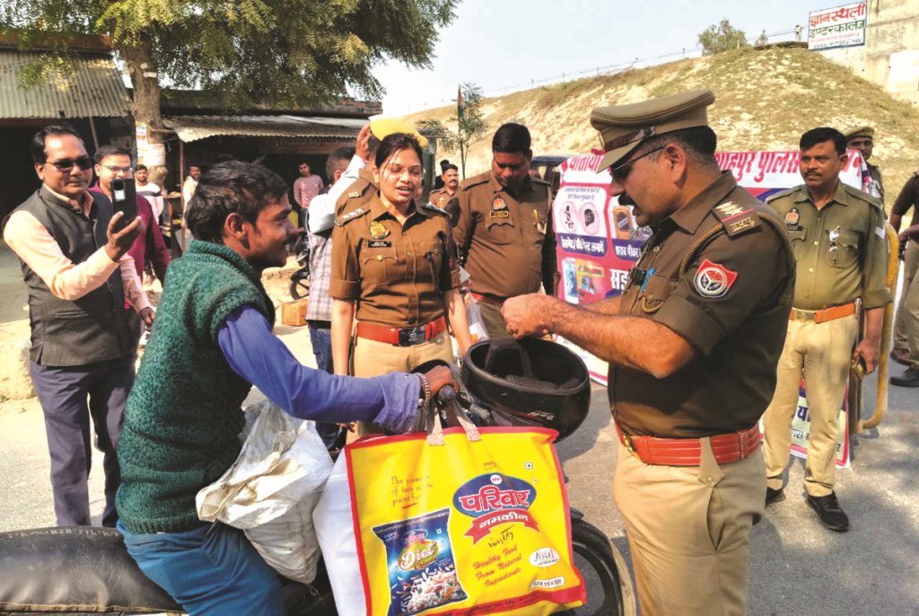 मुंगराबादशाहपुर। यातायात माह के तहत शुक्रवार को सीओ प्रतिमा वर्मा के नेतृत्व में प्रभारी निरीक्षक जयप्रकाश यादव मय फोर्स के साथ गोविन्दासपुर चौराहे पर यातायात अभियान चलाया गया। इस दौरान पुलिस ने नि:शुल्क हेलमेट वितरित किए और वाहनों में रिफ्लेक्टर लगाए। सीओ प्रतिमा वर्मा और थाना प्रभारी जयप्रकाश यादव ने यातायात अभियान के दौरान 60हेलमेट महिलाओं एवं वरिष्ठ नागरिकों में वितरित किए। उन्होंने हेलमेट पहने मिले बाइक सवारों का सम्मान किया और उन्हें माला पहनाकर उनका उत्साहवर्धन किया। पुलिस अधिकारियों ने हेलमेट के उपयोग को जीवन रक्षा का अनिवार्य उपाय बताते हुए लोगों को यातायात नियमों के पालन के लिए प्रेरित किया, साथ ही अभियान के तहत दो हज़ार वाहनों पर रिफ्लेक्टर टेप लगाए गए। सीओ प्रतिमा वर्मा ने अपील करते हुए कहा कि यातायात नियमों का पालन करना हमारी जिम्मेदारी है। कृपया नशे में ड्राइविंग न करें, हेलमेट पहनें, सीट बेल्ट लगाएं और मोबाइल फोन का उपयोग करने से बचें। इन छोटी-छोटी बातों का ध्यान रखकर हम अपनी और दूसरों की जान बचा सकते हैं। थाना प्रभारी जयप्रकाश यादव ने कहा कि हमारा उद्देश्य है कि लोगों को यातायात नियमों के प्रति जागरूक करना और उन्हें सुरक्षित रखना। हम हेलमेट और रिफ्लेक्टर के उपयोग को बढ़ावा देने के लिए प्रतिबद्ध हैं। स्थानीय नागरिकों ने मुंगराबादशाहपुर पुलिस की इन पहलों को सड़क सुरक्षा के लिए बेहद प्रभावी बताया और इसकी सराहना की। इस अवसर पर सीओ प्रतिमा वर्मा, प्रभारी निरीक्षक जय प्रकाश यादव, उपनिरीक्षक महेश राव, उपनिरीक्षक सुनील यादव, उपनिरीक्षक सुरेन्द्र तिवारी, हेड कांस्टेबल रामचंद्र सिंह, हेड कांस्टेबल वीरेंद्र सिंह, हेड कांस्टेबल धर्मेन्द्र, कांस्टेबल दिनेश सोनकर, कांस्टेबल संदीप यादव, कांस्टेबल अमित यादव महिला आरक्षी सोनम सिंह व कांस्टेबल जितेंद्र यादव आदि लोग मौजूद रहे।