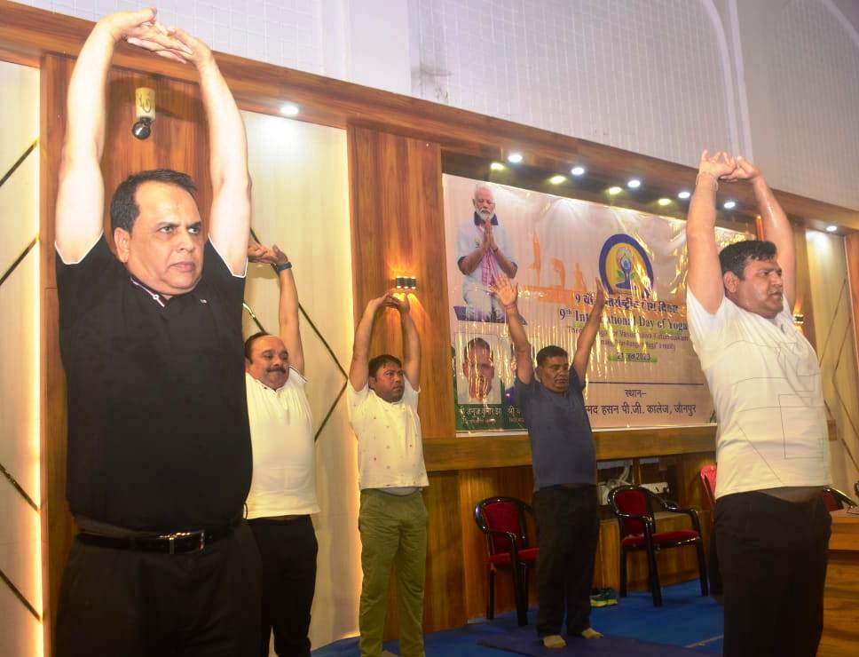 जौनपुर धारा, जौनपुर। अंतर्राष्ट्रीय योग दिवस के अवसर पर मोहम्मद हसन पीजी कॉलेज के सौदागर हाल में योग शिविर का आयोजन किया गया। इस योग शिविर के मुख्य अतिथि सिटी मजिस्ट्रेट देवेंद्र सिंह रहे। सर्वप्रथम प्राचार्य डॉ. अब्दुल कादिर खान ने पुष्प एवं बुके देकर मुख्य अतिथि का स्वागत किया। प्राचार्य डॉ. अब्दुल कादिर खान ने कहा कि आज समाज में गलत खान-पान और अनियमित दिनचर्या के कारण बहुत सारी ऐसी बीमारियां हो रहीं, जिससे बचने के लिए हमे प्रति दिन योग करना चाहिए। आज लोग सिर्फ दिवस पर ही योग करते हैं पर ऐसा गलत है हमे अपने नियमित कार्यों कि तरह योगा को भी सम्मिलित करना चाहिये। मुख्य अतिथि देवेंद्र सिंह ने कहा कि योग को अपने जीवन में रोज का आधार बनाए। योगा एक दिन करने से कोई भी निदान नहीं होगा। शारीरिक और मानसिक स्वास्थ के लिए योग अति आवश्यक है। आज इतने भागदौड़ भरे माहौल में लोग अपने स्वास्थ के लिए समय नहीं निकाल पाते हैं। बाकी हर कार्य के लिए उनके पास समय रहता है पर समय की मांग को देखते हुए हम सबको नियमित रूप से अपने जीवन शैली में व्यायाम और योग को स्थान देना चाहिए। भारत सरकार भी आज इस मुद्दे पर बहुत ध्यान दे रही है और लोगों को जागरूक भी करने का कार्य कर रही है। स्वर्गीय नूरुद्दीन गर्ल्स पीजी कॉलेज, मोहम्मद हसन इंटर कॉलेज एवं डालिम्स सनबीम स्कूल, मोहम्मद हसन स्पोर्ट एकेडमी के छात्र छात्राओं ने भी योगा किया। इस मौके पर जेएमएस ग्रुप चेयरमैन जितेंद्र यादव, प्रधानाचार्य मोहम्मद नासिर खान, डॉ. जीवन यादव, डॉ. शाहिद अलीम, डॉ. सिकंदर यादव, डॉ. प्रवीण यादव, अहमद अब्बास खान इत्यादि महाविद्यालय परिवार एवं छात्र-छात्राएं मौजूद रहे।