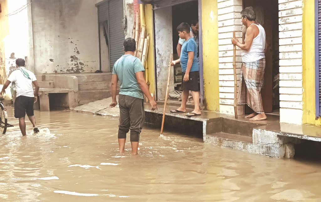 शनिवार की रात से रुक रुक कर हो रही मूसलाधार बारिश से शहर की सड़क जलमग्न हो गई। सावन महीना भर, मानसून की अनिश्चितता के बाद इन दिनों हो रही बारिश से किसानों के साथ प्रशासन और आम लोगों को भी बड़ी राहत मिली है। नगर में झमाझम बारिश से सड़क जलमग्न हो गई। क्षेत्र पानी से पूरी तरह डूब गया है। जिससे यह किसी तालाब की तरह नजर आ रहा था। एक तरफ जहां इस वर्षा से किसानों में खुशी देखी जा रही है। वहीं जल निकासी के अभाव में लोगों को भारी कठिनाइयों का सामना करना पड़ रहा है। तेज बारिश होने की वजह से बरसात का पानी जमा हो गया। घरों से लेकर मुख्य गेट तक पानी जमा हो जाने से लोगों को कठिनाई का सामना करना पड़ा। शनिवार को मध्यरात्रि से ही आसमान में घने बादल दिखाई दिए, देर रात्रि से ही अगले दिन सुबह रविवार तक झमाझम बारिश हो गई। इस दौरान पूरे दिन बारिश होती रही। दोपहर बाद से पानी कुछ देर के लिये रूका लेकिन आसमान में बादल छाये रहें और कुछ-कुछ देर पर रूक-रूक कर बारिश होती रही। इस दौरान जलभराव ने लोगों की मुसीबत बढ़ा दी। नगर के इशापुर, कालीकुत्ती, लाइनबाजार सहित कई स्थानों पर पानी भर गया। जिसके कारण यातायात प्रभावित हुआ। ईशापुर और कालीकुत्ती रोड का तो बहुत बुरा हाल था। सड़क पर करीब एक फिट से ज्यादा पानी भर गया। लोगों को परेशानी हुई, कई बाइक चालक पानी में गिर भी गए। रविवार को सुबह ही जोगियापुर पुल के पास सड़क धस गई है जिसके चलते आवागमन में दिक्कत हो रही है सड़क जो नमामि गंगे के अंतर्गत पाइप लाइन लगाई गई थी। बारिश के चलते सड़क धस गई और सड़क के नीचे जो मिट्टी है। वह बैठ गई। जिससे कभी भी दुर्घटना हो सकती है।