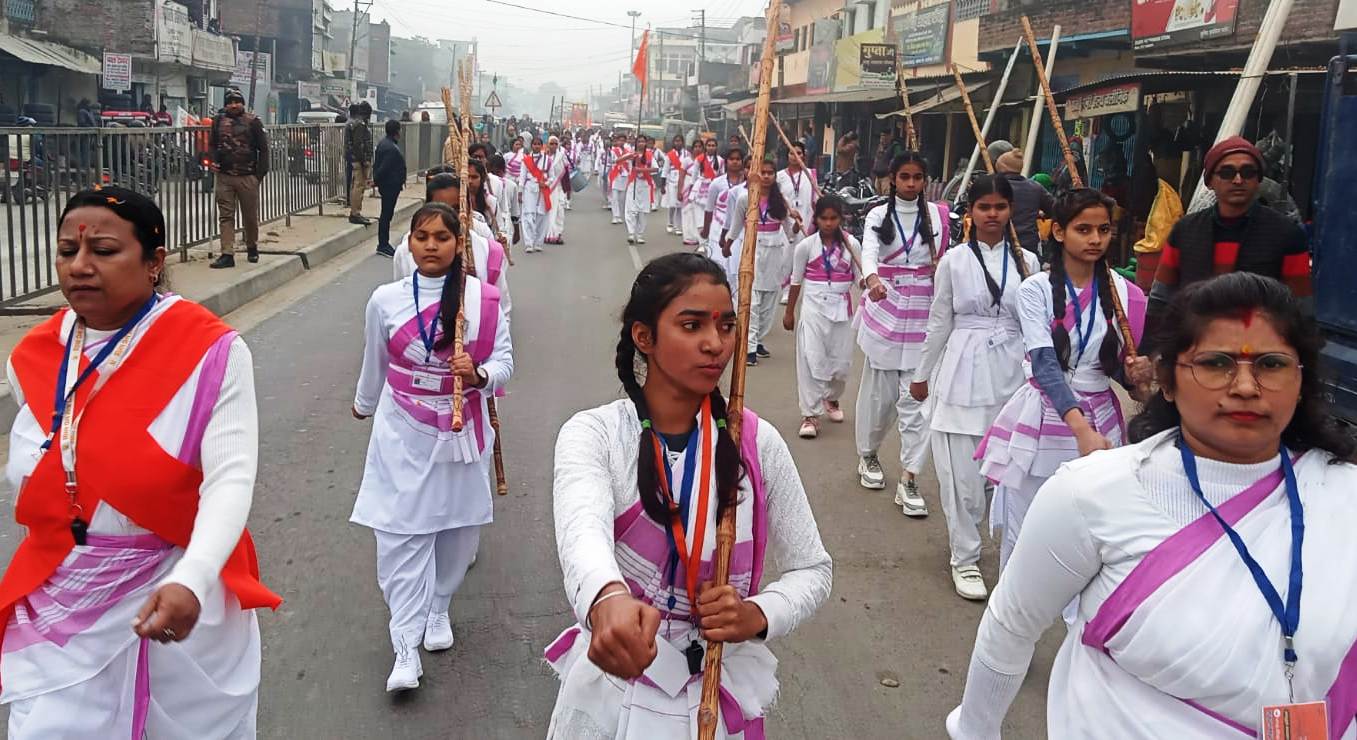 जौनपुर धारा, मछलीशहर। राष्ट्रीय सेवक संघ की महिला इकाई राष्ट्रीय सेविका समिति ने बुधवार दोपहर पूरे नगर में पथ संचलन किया। नगर के एसएम पब्लिक स्कूल में आरएसएस के महिला इकाई का पाँच दिवसीय आत्मरक्षा शिविर का आयोजन चल रहा है। बुधवार पाँचवे दिन महिला इकाई द्वारा नगर के सुजानगंज चौराहे से बरईपार चौराहा, रोडवेज, चुंगी चौराहा, सरस्वती नगर, मंगल बाजार, सब्जी मंडी, सराय, शादिगंज, मुंगराबादशाहपुर चौराहा होते हुए पुन: उसी चौराहे तक पथ संचलन कार्यक्रम का आयोजन हुआ। इस दौरान महिला इकाई ने बड़े बड़े ढोल नगाड़े की धुन के साथ तिरंगा झंडा लेकर भारत माता की तस्वीर के साथ पथ संचलन किया। पथ संचलन के दौरान महिला इकाई की डॉ. सुशीला गुप्ता, डॉ. अर्चना शुक्ला, आशा मौर्य, सुमन, किरन सहित सैकड़ों महिला स्वयंसेवी मौजूद रहीं। वहीं पुरुष इकाई के ओम प्रकाश, डा. सुनील गुप्ता, राजेश उमर वैश्य, अरविंद गुप्ता समेत दर्जनों स्वंय सेवक मौजूद रहे। सुरक्षा की दृष्टि से तिराहे पर ही प्रभारी निरीक्षक देवानंद रजक ने वाहनों का आवागमन रोक स्वंय पुलिस फोर्स के साथ पथ संचलन पूर्ण करवाया।