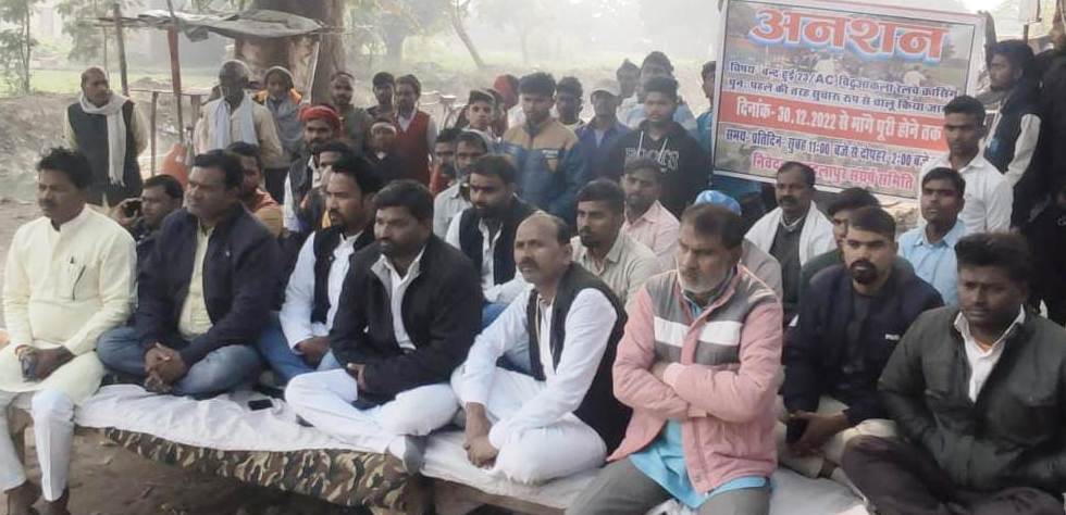 जौनपुर धारा, बदलापुर। कोतवाली क्षेत्र के बिठुआ कला रेलवे फाटक किनारे शुक्रवार की सुबह 11 बजे से दोपहर 2 बजे तक अपनी मांगों को लेकर अनिश्चितकालीन आमरण-अनशन पर दर्जनों ग्रामीण बैठ गए हैं। ग्रामीणों का कहना है कि 23/एसी बिठुआ कला रेलवे फाटक 23 दिसंबर से अधिकांश बंद रहता है। जिसको लेकर हजारों ग्रामीण, किसान, छात्र-छात्राओं को आवागमन में भारी कठिनाइयों का सामना करना पड़ रहा है। जबकि उक्त सम्बन्ध में पूर्व में श्रीकृष्णा नगर रेलवे स्टेशन अधीक्षक को ज्ञापन भी दिया जा चुका है कि पूर्व की भांति उक्त रेलवे फाटक को समय-समय पर बंद किया जाए और खोला जाए। जबकि रेलवे विभाग उक्त फाटक को ट्रैफिक के अनुसार संचालित करना चाहता है और हम ग्रामीणों की मांग पर कोई अमल नहीं कर रहा है जिसको लेकर विवेक यादव की अध्यक्षता में दर्जनों की संख्या में ग्रामीणों ने अनिश्चितकालीन आमरण-अनशन पर बैठे हैं जिसमें राजेश बिंद, ओमप्रकाश गुप्ता, विकास मिश्रा, राजीव यादव, प्रेमचंद बिंद, पंचमराम सरोज, अरबाज खान, पुनीत तिवारी सहित आदि लोग रहे।
