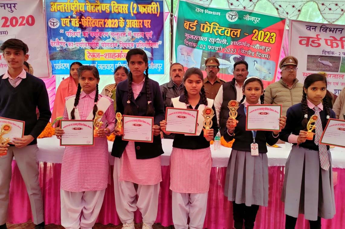 जौनपुर धारा, खेतासराय। विश्व वेटलैंड दिवस के मौके पर गुरुवार को वन विभाग के खुदौली स्थित वन पार्क में बर्ड फेस्टिवल मनाया गया। इस मौके पर स्कूली बच्चों को गूजरताल में पक्षियों का दीदार कराया गया। स्कूली बच्चों ने पेंटिंग और निबंध के माध्यम पर्यावरण संरक्षण का संदेश दिया। उप प्रभागीय वन अधिकारी ने बच्चों को पर्यावरण संरक्षण के प्रति विभिन्न जानकारी दी। कहा कि वन और जीव का संरक्षण करना चाहिए। मानव की तरह जीव जंतुओं का भी जीने का अधिकार है। पक्षियों का भक्षण नहीं करना चाहिए। वन, नदी और पहाड़ हमारे धरोहर हैं। प्रकृति की बनाई हुई धरोहर से छेड़छाड़ नहीं करना चाहिए। छेड़छाड़ प्राकृतिक आपदा का कारण बनते है। इस मौके पर निबंध और चित्रकला प्रतियोगिता का आयोजन हुआ। जिसमें अरिहंत कालेज खेतासराय, पैराडाइज इंटर कालेज खुटहन, प्राथमिक विद्यालय के बच्चे शामिल रहे। निबंध प्रतियोगिता में अदनान अहमद और चित्रकला में अंतिमा राजभर को प्रथम स्थान मिला। स्थान पाने वाले छात्रों को मुख्य अतिथि द्वारा स्मृति चिन्ह व प्रशस्ति पत्र देकर पुरस्कृत किया गया। इस मौके पर पूर्व वन क्षेत्राधिकारी गौतम प्रसाद चतुर्वेदी, क्षेत्रीय वन क्षेत्राधिकारी सीबी सिंह, महेंद्र देव विक्रम, जयहिंद यादव, कपिलदेव मिश्रा, गोरख प्रसाद,महंगू मौर्य मौजूद रहे। कार्यक्रम के अंत मे कार्यक्रम के आयोजक वन क्षेत्राधिकारी शाहगंज सीबी सिंह ने आगंतुकों के प्रति आभार प्रकट किया।