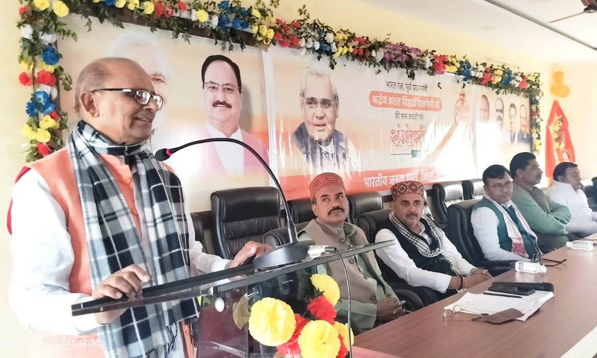 मुख्य अतिथि अशोक चौरसिया ने उपस्थित कार्यकर्ताओं को सम्बोधित करते हुये कहा कि अटल बिहारी वाजपेयी का जन्म 25 दिसम्बर 1924 को मध्य प्रदेश के ग्वालियर में रहने वाले एक विनम्र स्कूल शिक्षक के परिवार में हुआ था। वाजपेयी 1996 में बहुत कम समय के लिए प्रधानमंत्री बने थे। पंडित जवाहर लाल नेहरू के बाद वह पहले ऐसे प्रधानमंत्री थे जो लगातार दो बार प्रधानमंत्री बने और वो भी गैर कांग्रेसी। वह राजनीति के क्षेत्र में चार दशकों तक सक्रिय रहे। स्वर्णिम चतुर्भुज परियोजना, जिसने भारत के चारों महानगरों दिल्ली, मुंबई, कोलकाता और चेन्नई को सड़क मार्ग से जोड़ने की शुरुआत वाजपेयी के कार्यकाल में हुई और सभी नदियों को जोड़ने का प्रयास किया परन्तु सरकार चली जाने के बाद इस पर काम बंद हो गया था अब मोदी सरकार आने के बाद उप पर तेजी से काम चल रहा हैं। अध्यक्षता कर रहे पूर्व अध्यक्ष हरिशचंद्र सिंह ने कहा कि अटल बिहारी वाजपेयी ने अपना कैरियर पत्रकार के रूप में शुरू किया था और 1951 में भारतीय जन संघ में शामिल होने के बाद उन्होंने पत्रकारिता छोड़ दी। उन्होंने कई कवितायेँ लिखी जिसे समीक्षकों द्वारा सराहा गया। सामाजिक समानता के समर्थक अटल बिहारी वाजपेयी भारत को सभी राष्ट्रों के बीच एक दूरदर्शी, विकसित, मजबूत और समृद्ध राष्ट्र के रूप में आगे बढ़ते हुए देखना चाहते थे। उन्हें भारत के प्रति उनके निस्वार्थ समर्पण और पचास से अधिक वर्षों तक देश और समाज की सेवा करने के लिए भारत का सर्वोच्च नागरिक सम्मान भारत रत्न से सम्मानित किया गया। 1994 में उन्हें भारत का सर्वश्रेष्ठ सांसद चुना गया। अपने नाम के ही समान, अटलजी एक प्रतिष्ठित राष्ट्रीय नेता, प्रखर राजनीतिज्ञ, नि:स्वार्थ सामाजिक कार्यकर्ता, सशक्त वक्ता, कवि, साहित्यकार, पत्रकार और बहुआयामी व्यक्तित्व वाले व्यक्ति हैं। पूर्व विधायक सुषमा पटेल ने कहा कि छात्र जीवन से वे राष्ट्रीय स्वयंसेवक संघ के स्वयंसेवक बने तभी से राष्ट्रीय स्तर की प्रतियोगिताओं में भाग लेते रहे।1999 में ही उनके नेतृत्व में 13 दलों की गठबंधन सरकार बनी, जिसने सफलतापूर्वक पांच साल का कार्यकाल पूरा किया, जो अपना कार्यकाल पूरा करने वाली पहली गैर कांग्रेसी सरकार थी। 1957में यूपी के बलरामपुर सीट से बतौर जनसंघ प्रत्याशी उन्होंने जीत हासिल की 1967 से 1977 तक जनता पार्टी की स्थापना के बाद से बीस साल तक लगातार संसदीय दल के नेता रहे। पूर्व जिला उपाध्यक्ष अजीत प्रजापति मण्डल अध्यक्ष धर्मेंद्र मिश्रा मण्डल उपाध्यक्ष मिली त्रिपाठी ने अटल विहारी वाजपेयी के कविता का पाठ किया। विकास शर्मा नरेन्द्र उपाध्याय ने भी अटल जी पर विचार व्यक्त किया। कार्यक्रम का संचालन कार्यक्रम के संयोजक एवं जिला महामंत्री अमित श्रीवास्तव ने कि