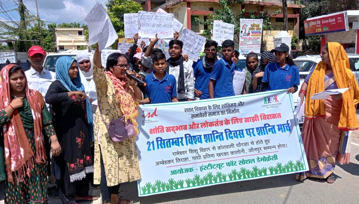 जौनपुर धारा, जौनपुर। विश्व शान्ति दिवस के अवसर पर जौनपुर नगर में इन्स्टीटयूट फार सोशल डेमोक्रसी ने नगर के रासमण्डल से शान्ति मार्च निकालकर जन संस्कृति मंच के संस्थापक सदस्य रहे जिले के वरिष्ठ कथाकार लेखक कामरेड अजय कुमार सिंह ने शान्ति दूतो को सम्बोधित करते हुए कहा कि यूरोप में पाबलो नेरूदा और मैडम क्यूरी का उल्लेख करते हुए कहा कि इन लोगों ने दुनिया के शांति दूतो से अपील करते हुए कहा था कि शान्ति कार्यकर्ताओ को जब तक दुनिया में शान्ति स्थापित न हो जाये तब तक शान्ति स्थापना के लिए प्रयास करते रहना होगा। उदभोदन के तत्पश्चात अजय कुमार ने हरी झण्डी दिखाकर शान्ति यात्रा को रवाना किया। मार्च नगर के मानिक चैक, अटाला मास्जिद, कोतवाली चैराहा, चारसु चैरहा, शाहीपुल, ओलन्दगंज, जिलाधिकारी परिसर होते हुए अम्बेडकर तिराहा होते हुए गॉधी प्रतिमा के पास यात्रा का समापन किया गया। मार्च तक 7 किमी. लम्बा मार्च में भारी संख्या में युवा लड़के/लड़कियाँ अपने हाथो में शान्ति सन्देशो से सुसज्जित तख्तिया व बैनर लेकर नारो से आकाश को गुन्जाते हुए चल रहे थे। युवाओ ने पूरे जोश के साथ मार्च में सहभागिता निभा रहे थे। कतार बद्ध युवाओ का जुलूस राहगीरो को बरबस ही अपनी ओर आक्रसित कर लेता था। मार्च के दौरान सामाजिक कार्यकर्ताओ ने राहगीरो दुकानदारो को शान्ति सद्भाव से भरा पर्चा लोगो के हाथो मे पकड़ाते जा रहे थे। लम्बे समय बाद नगर में शान्ति दिवस के अवसर पर नगर में युवाओ का बड़ा मार्च निकला मार्च के दौरान युवाओ ने गाँव गाँव से आयेंगे- शान्ति सद्भाव फैलायेंगे। शान्ति मार्च में अज़ाद शिक्षा केन्द्र से निसार अहमद खान, दिशा फाउण्डेशन से लाल प्रकाश राही, ग्लोबल कैम्पेन दलित मोमेन्ट शोभना स्मृति, आई.एस.डी.से प्रभा, सुफियान अहमद, बीनू, रीमू, ज्योतिका श्रीवास्तव, नीतू, प्रिंस श्रीवास्तव, नौशाद अहमद, के साथ ही शाहगंज, मछलीशहर, करंजाकला, नगरी क्षेत्र समेत जिले के आधा दर्जन ब्लाक के दर्जनो गॉव से सैकड़ो युवा लड़के/लड़किया शामिल हुए।