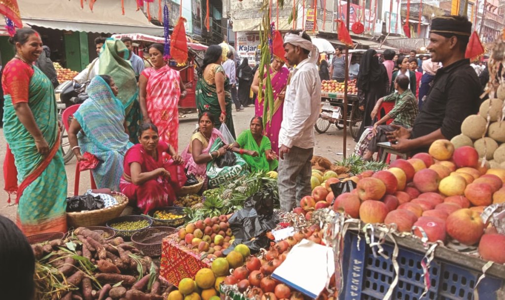 - बाजार में फलों व अन्य पूजा सामग्री की हुई खरीदारी