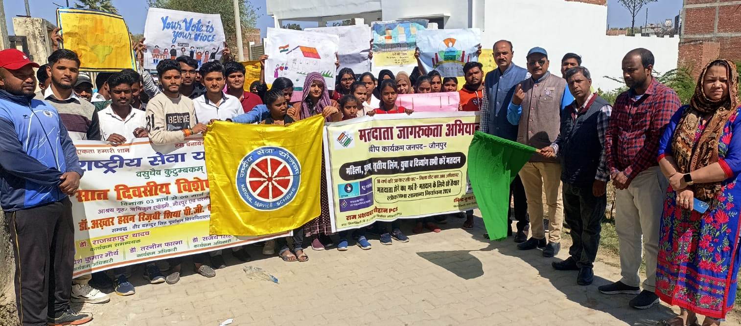 जौनपुर धारा,जौनपुर। मतदाताओं को जागरूक करने के लिए डॉ.अख्तर हसन रिज़वी शिया डिग्री कालेज के राष्ट्रीय सेवा योजना की इकाई से जुड़े छात्र-छात्राओं ने मंगलवार को मतदाता जागरूकता रैली निकाली। सहायक जिला निर्वाचन अधिकारी बृजेश चतुर्वेदी ने हरी झंडी दिखाकर रैली को रवाना किया। एनएसएस के कार्यक्रम अधिकारी डॉ.अवधेश कुमार की देखरेख में छात्रों ने मीरपुर, धन्नेपुर, मानेपुर, बड़कपुर, धरनीधरपुर आदि गांवों का भ्रमण कर लोगों को मतदान के प्रति जागरूक किया। रैली में छात्र-छात्राएं मतदाता जागरूकता बैनर व तख्ती लिए तथा लोगों को मतदान करने हेतु जागरुकता स्लोगन व नारे लगाते चल रहे थे। इस अवसर पर सहायक जिला निर्वाचन अधिकारी बृजेश चतुर्वेदी ने मतदान का महत्व समझाते हुए कहा कि लोकतंत्र में एक-एक वोट का महत्व है। सभी बच्चे अपने घर और पड़ोस के लोगों को लोकसभा चुनाव 2024 में मतदान करने के लिए जागरूक करे। इससे शत प्रतिशत मतदान का लक्ष्य हासिल करने में आसानी होगी। उन्होंने कहा है कि वोट प्रतिशत बढ़ाने में युवाओं की भूमिका महत्वपूर्ण होगी। उन्होंने जनपद के सभी महाविद्यालयो से अपील किया कि  एन.एस.एस. व रोवर्स रेंजर के लगने वाले शिविरों के माध्यम से मतदाताओं को जागरूक करने का कार्यक्रम चलाये और छात्र छात्राएं मतदान के लिए स्वयं व परिवार और आसपास के लोगों को जागरूक करें। कार्यक्रम का संचालन डॉ.अवधेश कुमार ने किया। इस अवसर पर डॉ.तस्नीम फात्मा, ई.शादाब हैदर, जयशंकर प्रसाद बिन्द कलन्दर, सतीश कुमार, हरेंद्र मौर्य, अंशुमान, राजन सहित शिया डिग्री कालेज के एनएसएस के छात्र-छात्राएं व क्षेत्रीय लोग उपस्थित रहे।