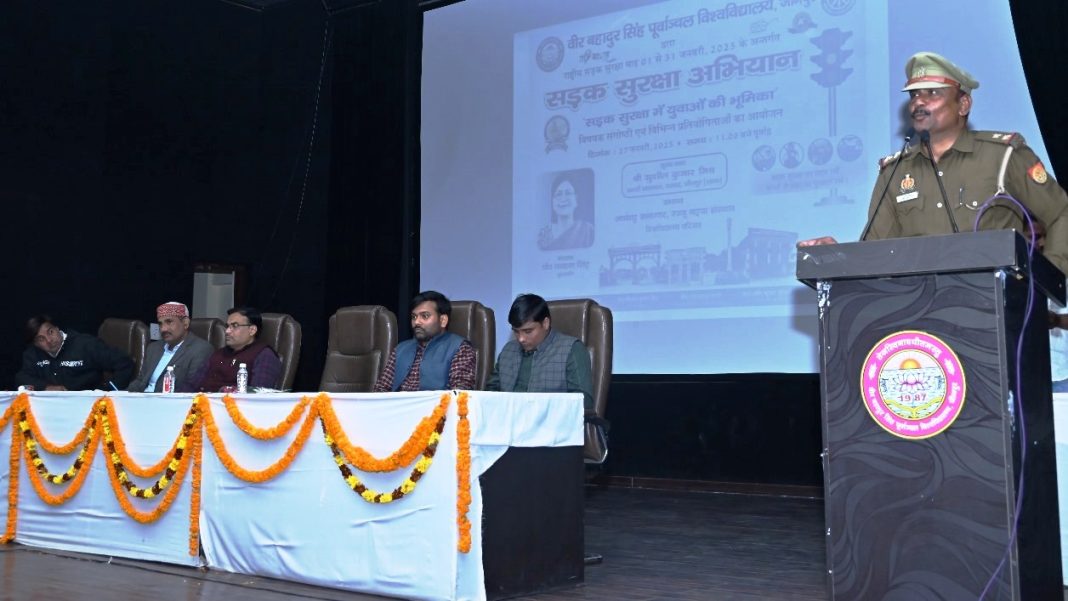 जौनपुर धारा,जौनपुर। पूर्वांचल विश्वविद्यालय में सड़क सुरक्षा में युवाओं की भूमिका विषयक संगोष्ठी का हुआ आयोजन 31जनवरी तक मनाया जाएगा। सड़क सुरक्षा माह पोस्टर, भाषण और निबन्ध प्रतियोगिताओं का हुआ आयोजन जौनपुर। वीर बहादुर सिंह पूर्वांचल विश्वविद्यालय के आर्यभट्ट सभागार में सोमवार को सड़क सुरक्षा जागरूकता अभियान के तहत ‘सड़क सुरक्षा में युवाओं की भूमिका’ विषय पर संगोष्ठी का आयोजन किया गया। कार्यक्रम के मुख्यवक्ता जौनपुर के यातायात प्रभारी सुशील मिश्रा ने युवाओं को सड़क सुरक्षा नियमों के प्रति जागरूक करते हुए कहा कि सड़क दुर्घटनाओं को रोकने में युवाओं की अहम भूमिका है।उन्होंने बताया कि हर साल भारत में सड़क दुर्घटनाओं में लाखों लोगों की जान जाती है, जिसमें से ज्यादातर दुर्घटनाएं यातायात नियमों की अनदेखी के कारण होती हैं। भारत युवाओं का देश है, युवा हमारे देश की पूंजी हैं। परन्तु एक छोटी सी लापरवाही से युवा पीढ़ी सड़क दुर्घटना से सबसे ज्यादा प्रभावित हैं, जो अत्यंत दुखद है। उन्होंने कहा कि यातायात पुलिस ने जौनपुर में पहले हेलमेट फिर चाभी नामक अभियान चलाया जिसे व्यापक जनसमर्थन मिला। राष्ट्रीय सेवा योजना के समन्वयक डॉ.राजबहादुर यादव ने कहा कि हमें सड़क सुरक्षा के प्रति अपने दायित्व का शत-प्रतिशत निर्वहन करते हुए अपने परिवारजनों और आस पड़ोस के अन्य लोगों को जागरूक करने का संकल्प लेना चाहिए। राजकीय महाविद्यालय मुफ्तीगंज के प्राचार्य डॉ.धर्मेन्द्र कुमार द्विवेदी ने कहा कि हम सड़क सुरक्षा के नियमों को अपने दिनचर्या का हिस्सा बनाएं तभी जाकर सड़क दुर्घटनाओं में कमी आ सकेगी। जनसंचार विभाग असिस्टेंट प्रोफेसर डॉ.दिग्विजय सिंह राठौर ने विद्यार्थियों को संबोधित करते हुए कहा कि हमें सड़कों पर आत्मसंयम और नियंत्रित होकर वाहन चलाएं। उन्होंने युवाओं से आह्वान किया कि जोश में होश न खोएं आपके परिवार और समाज को आपसे बड़ी अपेक्षाएं हैं। इस अवसर पर विद्यार्थियों ने विभिन्न प्रतियोगिताओं में भाग लिया। भाषण प्रतियोगिता में 68छात्रों ने सड़क सुरक्षा पर अपने विचार व्यक्त किए। निबंध प्रतियोगिता में 55छात्रों ने ‘युवाओं की भूमिका और सड़क सुरक्षा’ विषय पर निबंध लिखे। प्रश्नोत्तरी प्रतियोगिता में 50छात्रों ने सड़क सुरक्षा से जुड़े सवालों के जवाब दिए, जबकि पोस्टर प्रतियोगिता में 40 से अधिक छात्रों ने रचनात्मक पोस्टर बनाकर सड़क सुरक्षा का संदेश दिया। कार्यक्रम की अध्यक्षता रज्जू भइया संस्थान के निदेशक प्रो.प्रमोद यादव ने की। उन्होंने युवाओं को सड़क सुरक्षा का ब्रांड एंबेसडर बनने की प्रेरणा दी और कहा कि यातायात नियमों का पालन करना केवल कानून का सम्मान नहीं, बल्कि दूसरों 