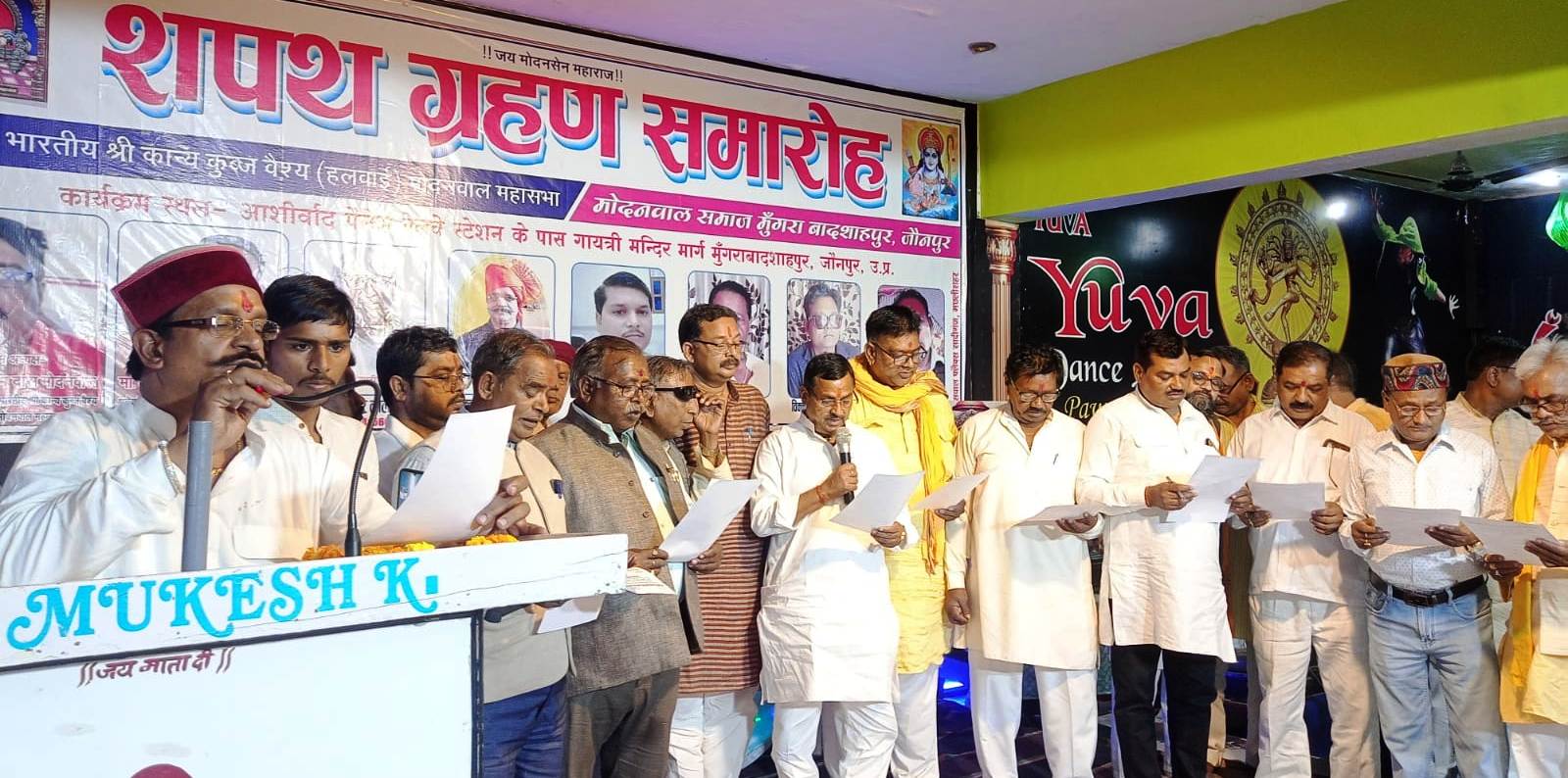 जौनपुर धारा, मुंगराबादशाहपुर। कस्बे में स्थित एक पैलेस पर आयोजित श्रीकान्य कुंज वैश्य हलवाई (मोदनवाल) समाज की तरफ से दो दिवसीय राष्ट्रीय व प्रांतीय बैठक एवं जिला कार्यकारिणी गठन का शपथ ग्रहण समारोह समाज के राष्ट्रीय अध्यक्ष घनश्याम दास मोदनवाल की अध्यक्षता में सकुशल संपन्न हुआ।