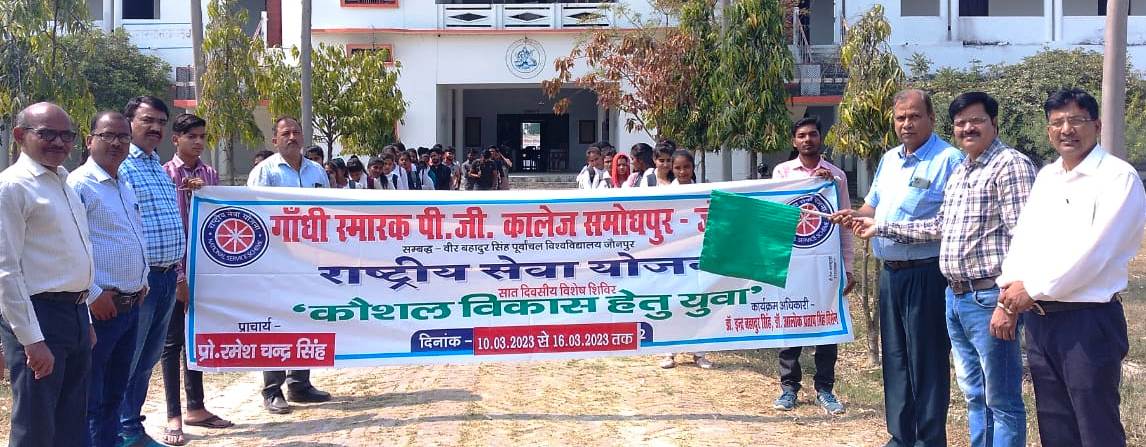 जौनपुर धारा, जौनपुर। गांधी स्मारक पीजी कॉलेज समोधपुर के प्रबंधक हृदय प्रसाद सिंह रानू के संरक्षकत्व में शुक्रवार को सात दिवसीय राष्ट्रीय सेवा योजना शिविर का उद्घाटन प्राचार्य प्रो. रमेश चंद्र सिंह ने किया गया। प्राचार्य ने स्वयंसेवकों को हरी झंडी दिखाकर शिविर स्थल के लिए रवाना किया। स्वयंसेवकों से आह्वान किया कि युवाओं में कौशल विकास हेतु विभिन्न गांव में जाकर जागरूक करें। उन्होंने बताया कि यदि राष्ट्र का युवा सशक्त होगा तभी देश शक्तिशाली हो सकता है। स्वयंसेवकों ने श्री सर्वेश्वरी समूह संस्थान शाखा समोधपुर में सफाई अभियान चलाकर स्वच्छता के प्रति जागरूकता का संदेश दिया। कार्यक्रम का संचालन डा. इंद्र बहादुर सिंह ने किया तथा आभार एवं धन्यवाद ज्ञापन कार्यक्रम अधिकारी डा. आलोक प्रताप सिंह विसेन ने किया। इस अवसर पर पूर्व कार्यक्रम समन्वयक प्रो. राकेश कुमार यादव, प्रो. अरविंद कुमार सिंह, डा. लक्ष्मण सिंह, डा. नीलमणि सिंह, डा. विकास कुमार यादव, डा. यूपी सिंह, डा. राजेश कुमार मौर्य आदि लोग उपस्थित रहे।