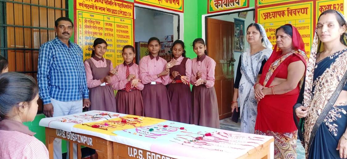 जौनपुर धारा, खुटहन। पूर्व माध्यमिक विद्यालय गोसाईंपुर में भाई-बहन के अटूट प्यार के प्रतीक पर्व पर अध्यापिकाओं व कला अनुदेशक मनोरमा गुप्ता के निर्देशन में बच्चों ने स्वयं आकर्षक राखियां बनाईं। छात्राओं ने छात्रों को राखी बांधकर रक्षाबंधन पर्व मनाया। इस अवसर पर प्रधानाध्यापक वीरेंद्र प्रताप ने बच्चों को रक्षाबंधन के पर्व की महत्ता बताई और बच्चों में मिष्ठान का वितरण कराया। इस अवसर पर अध्यापक डॉ.सीमा, बदामा यादव, सत्येंद्र कुमार यादव, मनोरमा गुप्ता, तारा देवी, विमला विश्वकर्मा आदि उपस्थित रहीं।