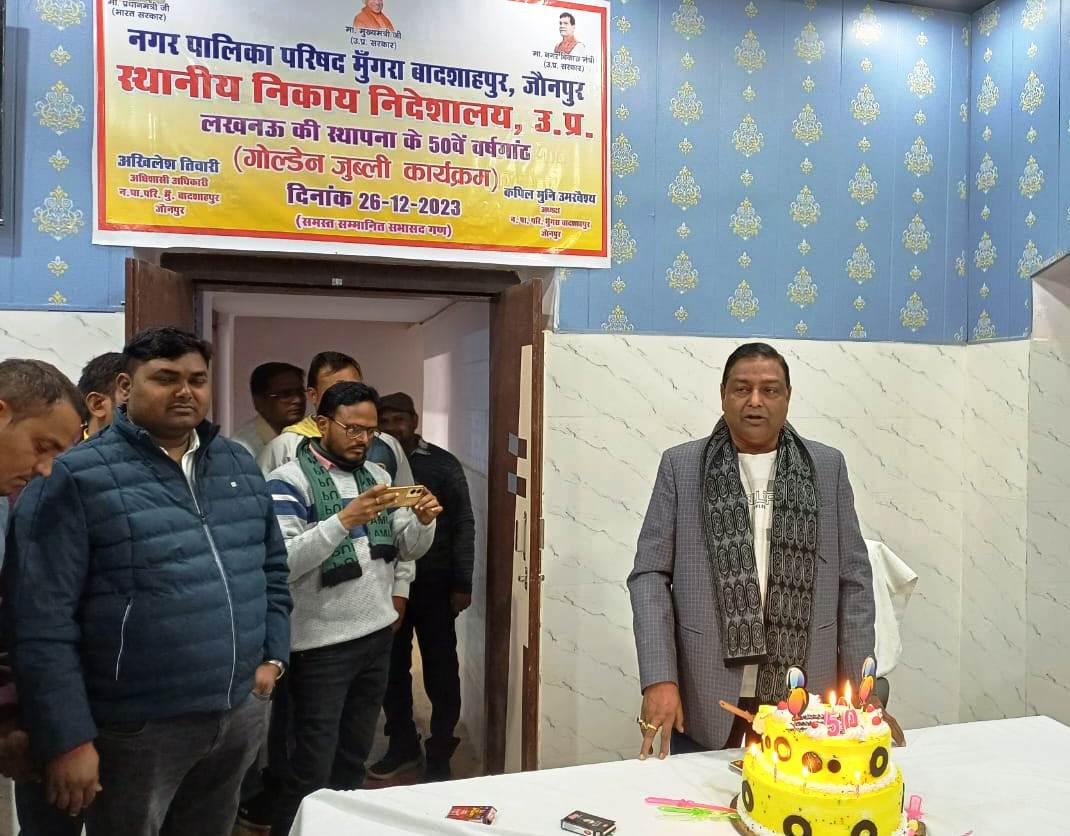 जौनपुर धारा, मुंगराबादशाहपुर। नगर पालिका परिषद मुंगरा बादशाहपुर में बने सभागार में मंगलवार को देर शाम सात बजे शासन के निर्देशनुसार स्थानीय निकाय निदेशालय उप्र.लखनऊ की स्थापना के 50वर्ष पूरा होने पर स्वर्ण जयन्ती समारोह आयोजित किया गया। इस दौरान नगर के सभासदों एवं नगर पालिका के अधिकारियों तथा कर्मचारियों के साथ ही नगर के संभ्रांत नागरिकों की मौजूदगी में नगर पालिका चेयरमैन कपिलमुनि उमरवैश्य ने केक काटकर 50वी वर्षगांठ मनाई। चेयरमैन कपिल मुनि ने अपने उद्बोधन में कहा कि नगर निकाय की इस गोल्डन जुबली कार्यक्रम में शामिल होने का सौभाग्य हमे प्राप्त हुआ है वह अविष्मरणीय है। उन्होंने कहा कि नगर के विकास में कई महत्वपूर्ण विकास भाजपा शासन काल में हुए है, जो अपने आप में एक मिसाल है। जिसकी साक्षी यहां की जनता है। आने-वाले समय में भी विकास की अनेकों कड़ियां जुड़ेगी। जिससे हमारा नगर विकास की दिशा में सबसे अगले पायदान पर आप लोगो को खड़ा नजर आएगा। इस दौरान चेयरमैन कपिल मुनि ने नगर के विकास से जुड़ी अनेक योजनाओं के सम्बन्ध में विस्तार से चर्चा करते हुए कहा कि आज के पचास साल पहले प्रदेश सरकार द्वारा नगर निकाय निदेशालय की स्थापना की गई थी। उस समय से हमेशा निदेशालय द्वारा नगर निकायों के विकास के लिए शहरी क्षेत्र में विभिन्न विकास योजनाएं चलाई जा रही है। वर्तमान प्रदेश सरकार का यह उद्देश्य है कि नगरों में रहने वाले लोगो को अधिक से अधिक सुविधाएं मिल सके। इसी के तहत स्थानीय नगर पालिका में भी अनेक विकास योजनाएं चलाई जा रही है। आगामी समय में केन्द्र सरकार के साथ ही प्रदेश सरकार द्वारा नगर के विकास के लिए तमाम नई योजनाएं आयेगी ऐसा मेरा विश्वास है। इस दौरान राजेश गुप्त, विशंभर दुबे, कामता प्रसाद यादव, गणेश गुप्त, संटी जायसवाल, अनिल कुमार, वीरेंद्र पटेल, सोएब, अवर अभियन्ता जलकल शिवानन्द वास्को, राजस्व निरीक्षक रामानुज शुक्ल, लिपिक ओंकारनाथ मिश्र सहित बड़ी संख्या में संभ्रांत जन एवं सभासदगण मौजूद रहे।