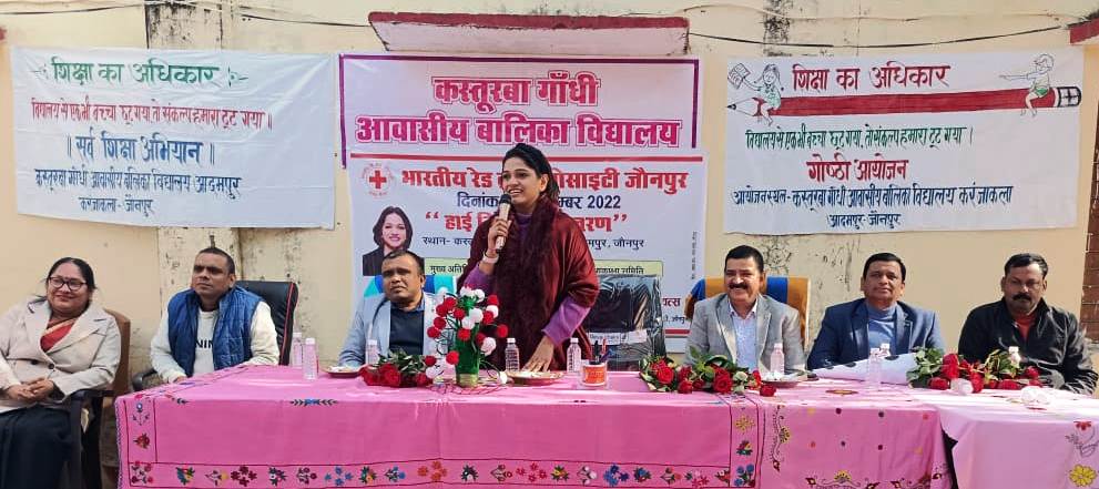 जौनपुर धारा, जौनपुर। करंजाकला ब्लाक के कस्तूरबा गांधी आवासीय बालिका विद्यालय के परिसर में भारतीय रेडक्रास सोसायटी की जौनपुर शाखा की तरफ से कार्यक्रम आयोजित कर सौ छात्राओं के बीच हाइजिन किट वितरित कर स्वच्छता एवं स्वास्थ के प्रति जागरूक किया गया। कार्यक्रम की मुख्य अतिथि आकांक्षा समिति की अध्यक्ष डा. अंकिता राज ने छात्राओं को संबोधित करते हुए कहा कि शुद्ध जल, स्वस्थ भेजन एवं नियमित व्यायाम कर मन मस्तिष्क को स्वस्थ रखा जा सकता है। स्वस्थ नागरिक ही देश व समाज के विकास में अपना समुचित योगदान दे सकता। छात्राओं द्वारा प्रस्तुत सांस्कृतिक कार्यक्रम की सराहना कर उनके हौसले को बढ़ाते हुए निडर व स्वावलंबी बनने की सीख दी। बीएसए डा. गोरखनाथ पटेल ने छात्राओं को रेडक्रास के बारे में विस्तार स्ो बताते हुए जनसेवा के लिए सदैव तत्पर रहने के लिए प्रेरित किया। रेडक्रास सोसायटी के सचिव डा. मनोज वत्स ने कहा कि आज छात्राएं प्रत्येक क्षेत्र में अपने ज्ञान, कौशल, व हुनर का लोहा मनवा रही हैं, किसी भी क्षेत्र में पुरुषों से कम नहीं हैं। उम्मीद है कि सभी शिक्षा, स्वास्थ्य, स्वच्छता के प्रति जागरूक होकर अन्य लोगों को भी जागरूक करने का काम करेंगे। कार्यक्रम का शुभारंभ मुख्य अतिथि डा. अंकिता राज द्वारा मां सरस्वती के चित्र पर माल्यार्पण व दीप प्रज्वलित कर किया गया। तत्पश्चात स्वागत गीत रिया, सुप्रिया द्वारा प्रस्तुत किया गया। अतिथियों का स्वागत वार्डेन किरण बाला मिश्रा  संचालन पुष्पा राय तथा आभार कोषाध्यक्ष डा. संदीप पाण्डेय ने ज्ञापित किया।