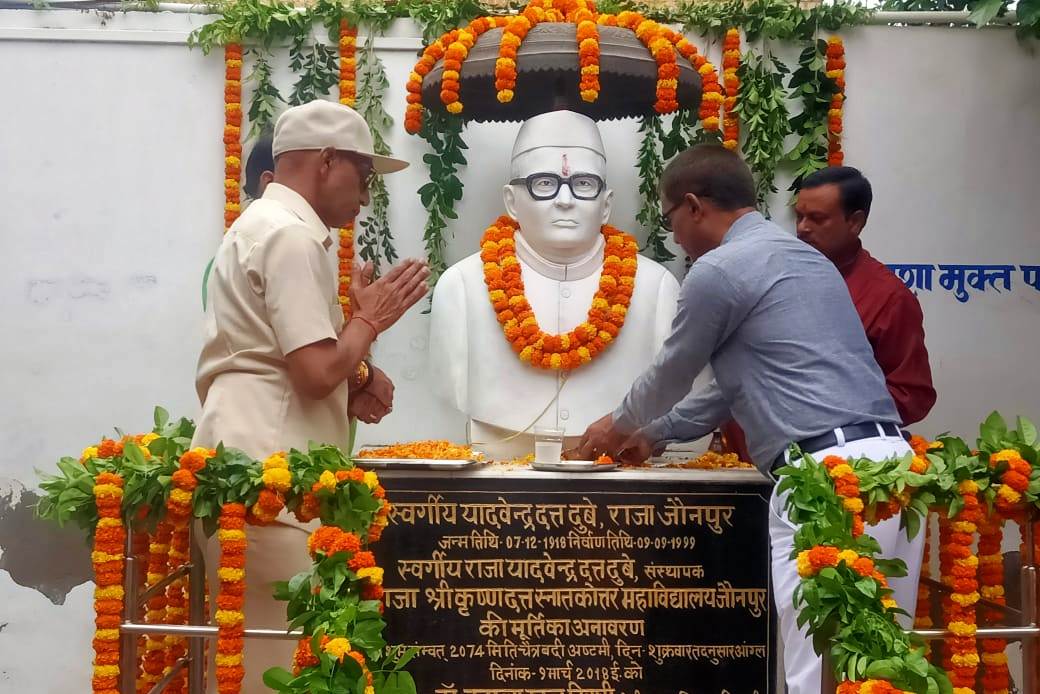 महाविद्यालय के प्राचार्य ने श्रद्वांजलि समारोह में राजा साहब को कुशल राजनीतिज्ञ, बहुमुखी प्रतिभा का धनी बताया। उन्होनें कहाकि महाविद्यालय में शिक्षण कार्य को और उन्नयन पर ले जाना ही स्व.राजा साहब के प्रति सच्ची श्रद्धांजलि होगी। श्रद्धांजलि संगोष्ठी को महाविद्यालय के पूर्व प्राचार्य कैप्टन डॉ.अखिलेश्वर शुक्ला ने संबोधित करते हुए बताया कि जौनपुर रियासत के ग्यारहवें नरेश राजा यादवेन्द्र दत्त का जन्म सन-1918 को जौनपुर राजमहल में हुआ था। राजा यादवेन्द्र दत्त भारतीय जनसंघ व भाजपा के संस्थापक सदस्यों में से एक रहे, तीन बार विधायक, नेता विरोधी दल व दो बार सांसद चुने गए। राजनीति के पुरोधा जौनपुर के राजा यादवेंद्र दत्त दुबे की आज पुण्यतिथि है। 09 सितंबर 1999 को इस दुनिया में अपने नश्वर शरीर को छोड़कर जाने वाले इस राजनीतिज्ञ को दो दशक से अधिक समय हो गए हैं, लेकिन आज भी उनकी यादें लोगों के बीच ताजा हैं। राज पीजी कालेज के भौतिक विज्ञान के विभागाध्यक्ष प्रो.अवधेश द्विवेदी ने बताया कि लोकसभा में राजा साहब अन्तर्राष्ट्रीय राजनीति पर बोल रहे थे, उनकी वाकपटुता को पूरा सदन एकाग्रता से सुन रहा था। उनका समय समाप्त होने पर लोकसभा अध्यक्ष ने उनको रोकना शुरू किया तो इस पर अटल बिहारी वाजपेयी व लालकृष्ण आडवानी ने अपना समय लोकसभा अध्यक्ष से आग्रह करके दिला दिया। डॉ.मयानन्द उपाध्याय, डॉ.लाल साहब यादव एवं डॉ.आशाराम यादव ने स्वर्गीय राजा साहब के व्यत्तिäतव एवं कृतित्व पर प्रकाश डाला। महाविद्यालय के समस्त शिक्षक एवं शिक्षणेत्तर कर्मचारियों ने राजा साहब की पुरानी यादों के माध्यम से उनको याद करके अपनी श्रद्धांजलि दी। श्रद्धांजलि सभा में डॉ.मयानन्द उपाध्याय, डॉ.अवधेश कुमार द्विवेदी, डॉ.मनोज वत्स, डॉ.अोमप्रकाश दुबे, डॉ.श्यामसुन्दर उपाध्याय, डॉ.आशीष शुक्ला, डॉ.रमेश सोनी, डॉ.अजय मिश्रा, डॉ.विवेक कुमार, डॉ.सुधा सिंह, डॉ.सुनीता गुप्ता, डॉ.नीता सिंह, डॉ.अनीता सिंह, डॉ.गगनप्रीत कौर सहित सभी शिक्षक एवं शिक्षणेत्तर कर्मचारी मौजूद रहे। संगोष्ठी का संचालन डॉ.संतोष कुमार पाण्डेय ने किया।