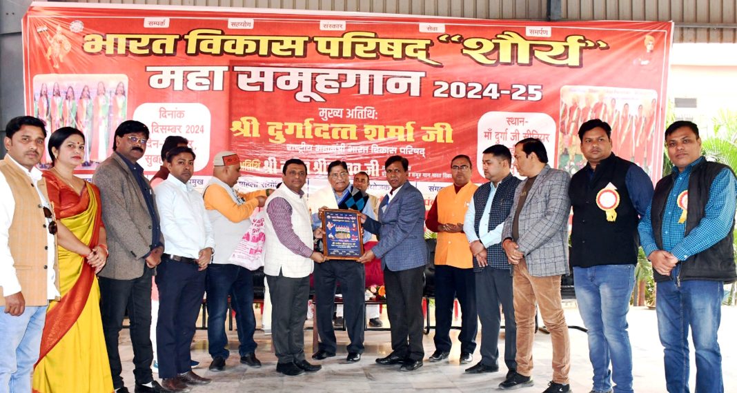 जौनपुर धारा, जौनपुर। भारत विकास परिषद शौर्य के अध्यक्ष डॉ.सन्दीप पाण्डेय के नेतृत्व में आयोजित महासमूह गान कार्यक्रम में मुख्य अतिथि के रूप में भारत विकास परिषद के राष्ट्रीय महामंत्री दुर्गादत्त शर्मा का आगमन हुआ। इस कार्यक्रम का आयोजन मां दुर्गा जी सीनियर सेकेण्ड्री स्कूल सिद्दीकपुर में किया गया। जिसमें विद्यालय के सभी 2500बच्चों ने इस महासमूह गान में प्रतिभाग किया। मंच से सोनपरी, तनुश्री, आराध्या, सृष्टि और मरियम ने ‘युगों—युगों से यही हमारी बनी हुई परिपाटी है’ गीत का गायन किया। इस कार्यक्रम का प्रारम्भ सर्वप्रथम भारत माता एवं स्वामी विवेकानन्द जी के चित्र पर पुष्प अर्पण एवं दीप प्रज्ज्वलन से किया गया। विद्यालय के बच्चों ने वन्दे मातरम गीत गाया। संस्थापक अध्यक्ष डॉ.सन्दीप पाण्डेय ने अपने स्वागत उद्बोधन में शौर्य शाखा के उदय से अभी तक के कार्यक्रमों पर चर्चा की और बताया कि संस्था सम्पर्क, सेवा और संस्कार के क्षेत्र में निरंतर कार्य कर रही है। मुख्य अतिथि ने अपने उद्बोधन में बच्चों के बीच में जाकर तिलक लगाने के विषय पर, सामुहिकता की शक्ति पर और संस्कार विषय पर बातचीत की। उन्होंने कहा कि सामुहिकता की शक्ति से पिछले चलने वाले का हाथ पकड़कर उसे भी साथ ले लिया जाता है। विशिष्ट अतिथि के रूप में उपस्थित राष्ट्रीय उपाध्यक्ष प्रकल्प समूह गान नवीन श्रीवास्तव ने अपने उद्बोधन में कहा कि राष्ट्र एक जीता जागता राष्ट्र पुरूष है। जिसकी बूंद—बूंद गंगा है, कश्मीर जिसका मतिष्क है। पंजाब और बंगाल जिसकी भुजाएं हैं और हम सभी को मिलकर ऐसी चेतना जगानी है। जिससे राष्ट्र परम वैभव को प्राप्त हो सके। प्रान्तीय अध्यक्ष रवि जायसवाल ने कहा कि जब हम समूह में बोलते हैं तो उसकी तीव्रता, ओजस्विता बढ़ जाती है। यही महासमूह गान का मुख्य उद्देश्य है। विद्यालय के प्रबन्धक सूर्यांश सिंह और प्रधानाचार्य एके सिंह ने शौर्य शाखा द्वारा किये गये कार्यों की सराहना की। कार्यक्रम के अन्त में अध्यक्ष डॉ.सन्दीप पाण्डेय, प्रकल्प प्रमुख सन्दीप चौधरी, कार्यक्रम संयोजक डॉ.बृजेश कन्नौजिया के द्वारा सभी अतिथियों को स्मृति चिन्ह एवं शाल भेंट किया गया। इस कार्यक्रम में डॉ.राम नारायण सिंह, डॉ.शैलेश सिंह, नीरज श्रीवास्तव, अतुल जायसवाल, अवधेश गिरि, जनार्दन पाण्डेय, आनन्द देव वर्मा, नित्यानन्द पाण्डेय, अरविन्द गिरि, अतुल मिश्रा, डॉ.राजेश कुमार, प्रमोद सैनी, ज्योति श्रीवास्तव, राहुल पाण्डेय, सुनील सिंह, रविन्द्र गुप्त, डॉ.अनिल सिंह, रमेश श्रीवास्तव आदि उपस्थित रहे। इस कार्यक्रम का सफल संचालन संस्था के कोषाध्यक्ष अमित पाण्डेय ने किया तथा संगठन सचिव पंकज सिंह ने सभी के प्रति आभार व्यक्त किया।
